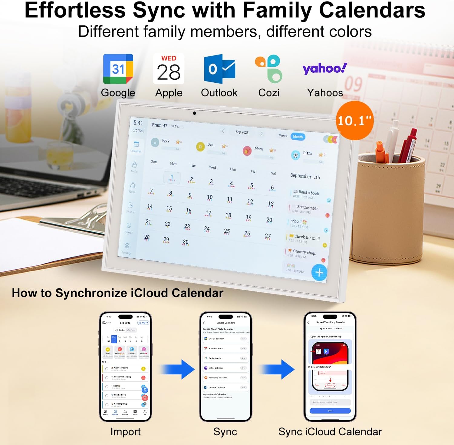【Smart Sync】: Effortlessly sync Google, iCloud, Outlook, Cozi, Yahoos and more via our free App :FotoCube (view and add events in vibrant HD clarity). How to Synchronize iCloud Calendar: 1. Click the import button; 2. Then click on “Sync” on the iCloud Calendar; 3. Sync iCloud Calendar. (Please refer to the instruction manual for detailed steps)
