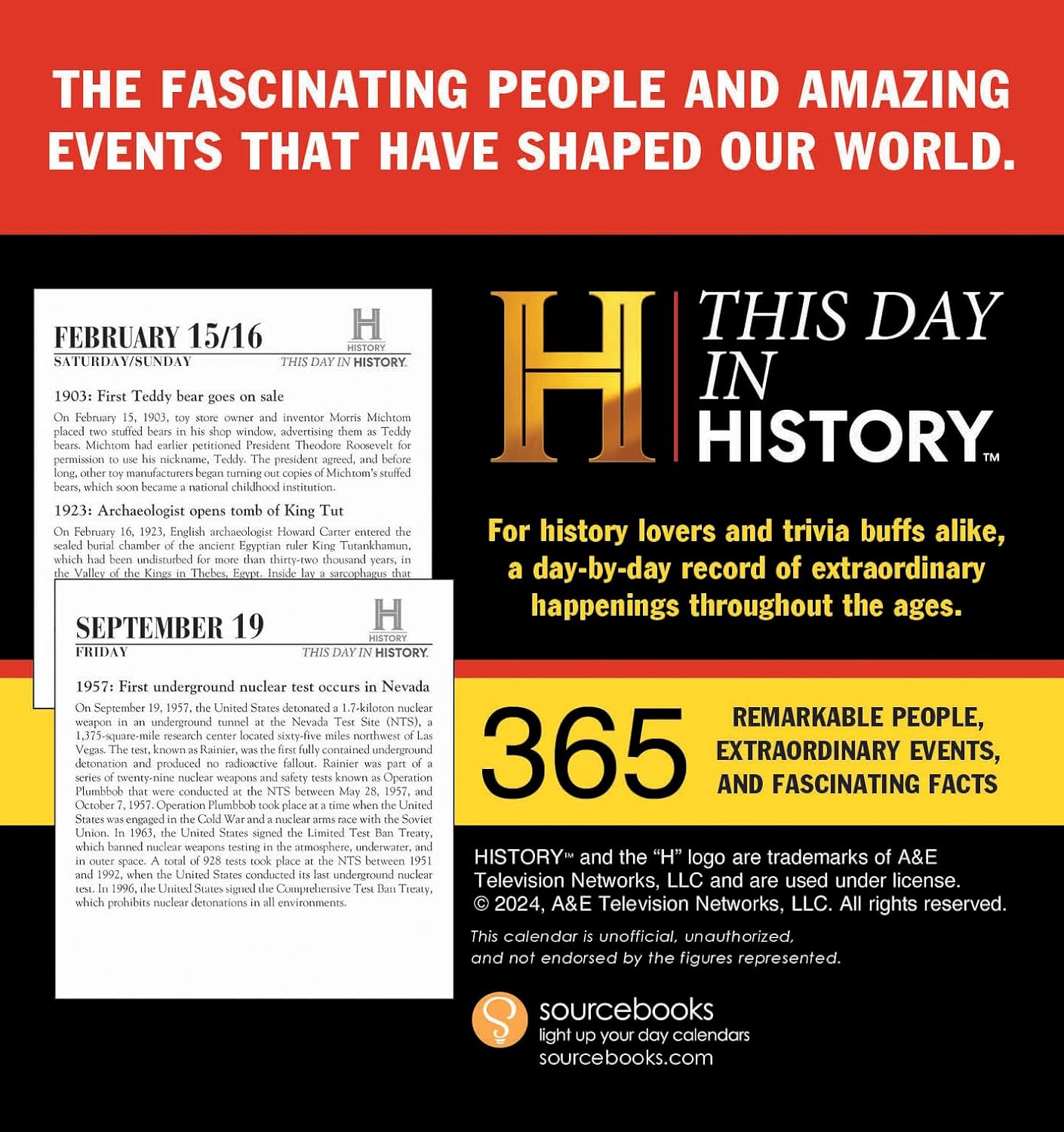 From one of the most relied-upon and best-respected sources of historical material, HISTORY™, comes a day-by-day record of extraordinary happenings throughout the ages! Packed full of influential events, remarkable accomplishments, groundbreaking inventions, and inspiring people, this 2025 history boxed calendar assembles 365 days of interesting facts from early civilization to the 21st century.