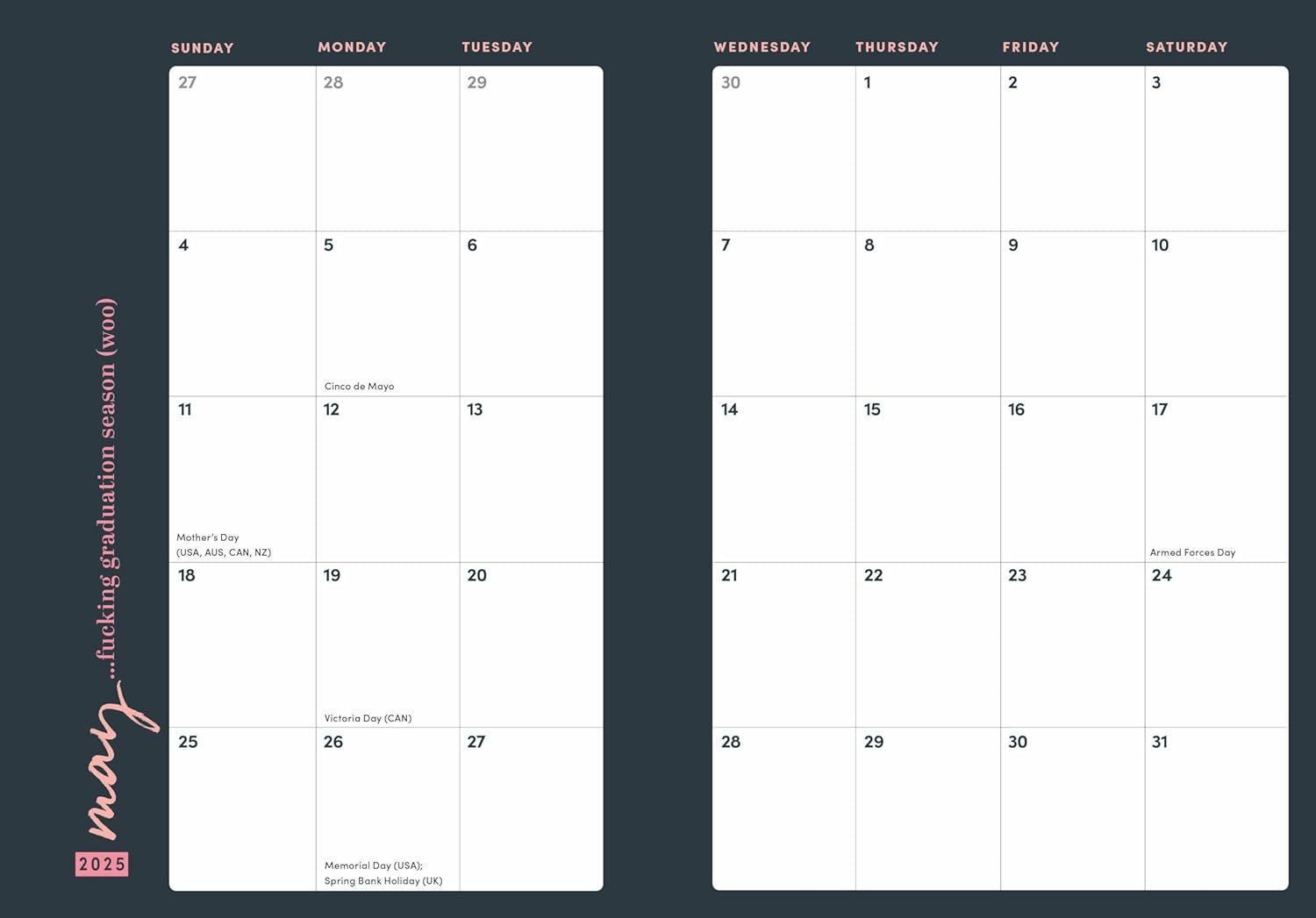 Take charge of your life and become the organized bitch you’ve always dreamed of being with this 2025 swear organizer! Packed with hilarious motivation, badass affirmations, and tons of sarcastic stickers, this purse-size engagement calendar will help you keep track of all of your important events and appointments, including “payday, bitches,” “another sh*tty meeting,” “someone’s f*cking birthday,” and more. Get f*cking empowered this year or give as the perfect funny and inspirational gift to the women in your life!