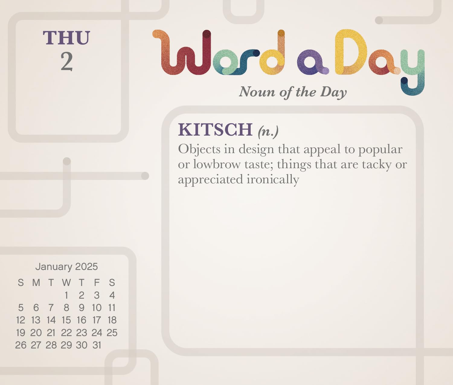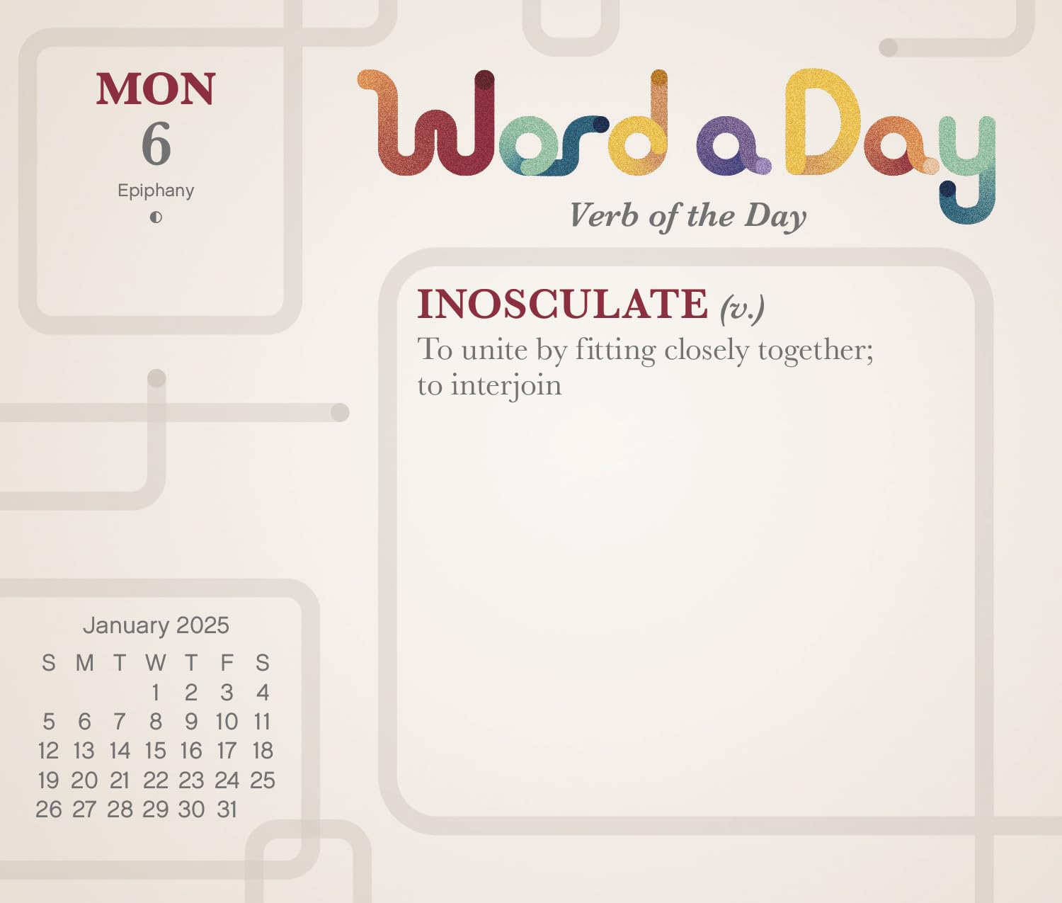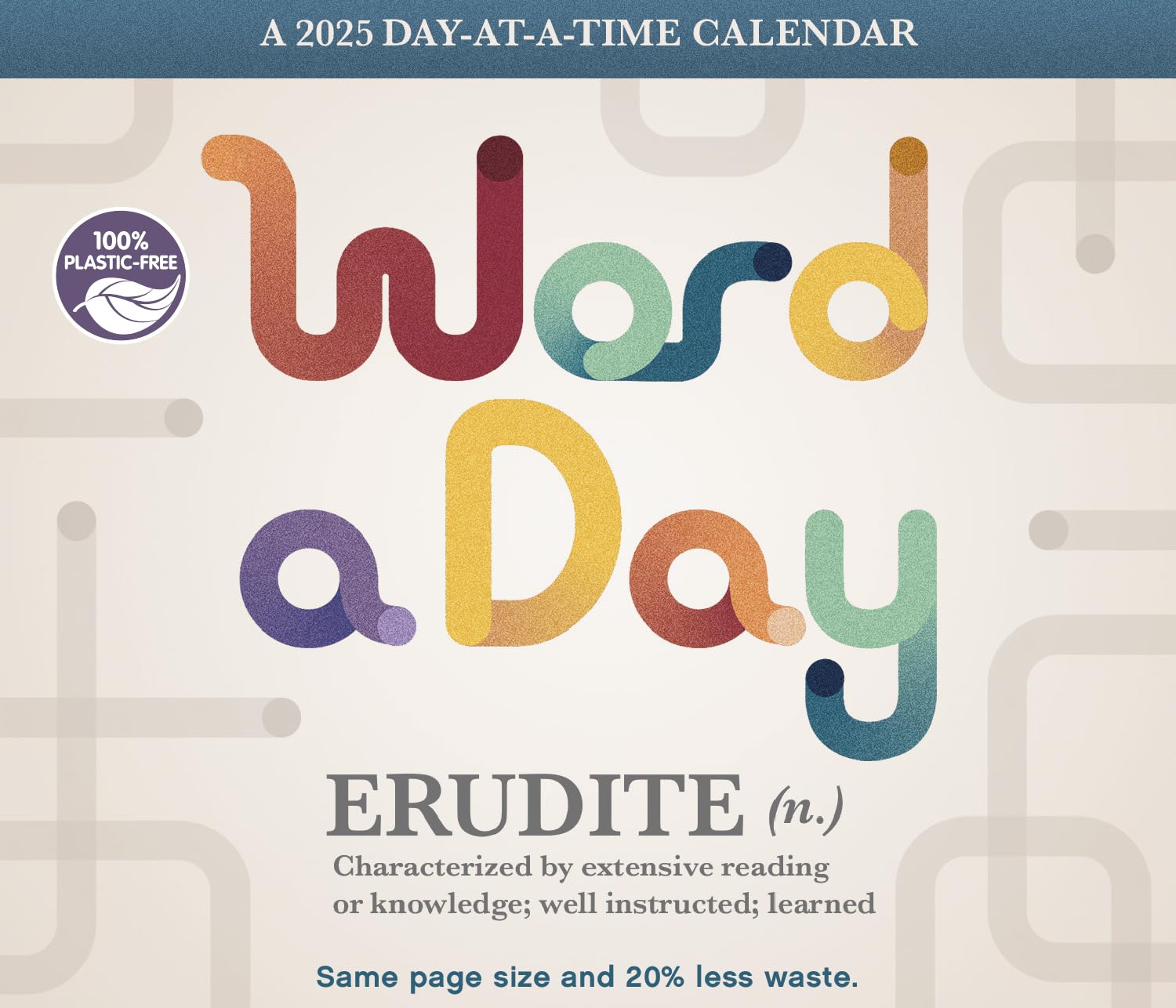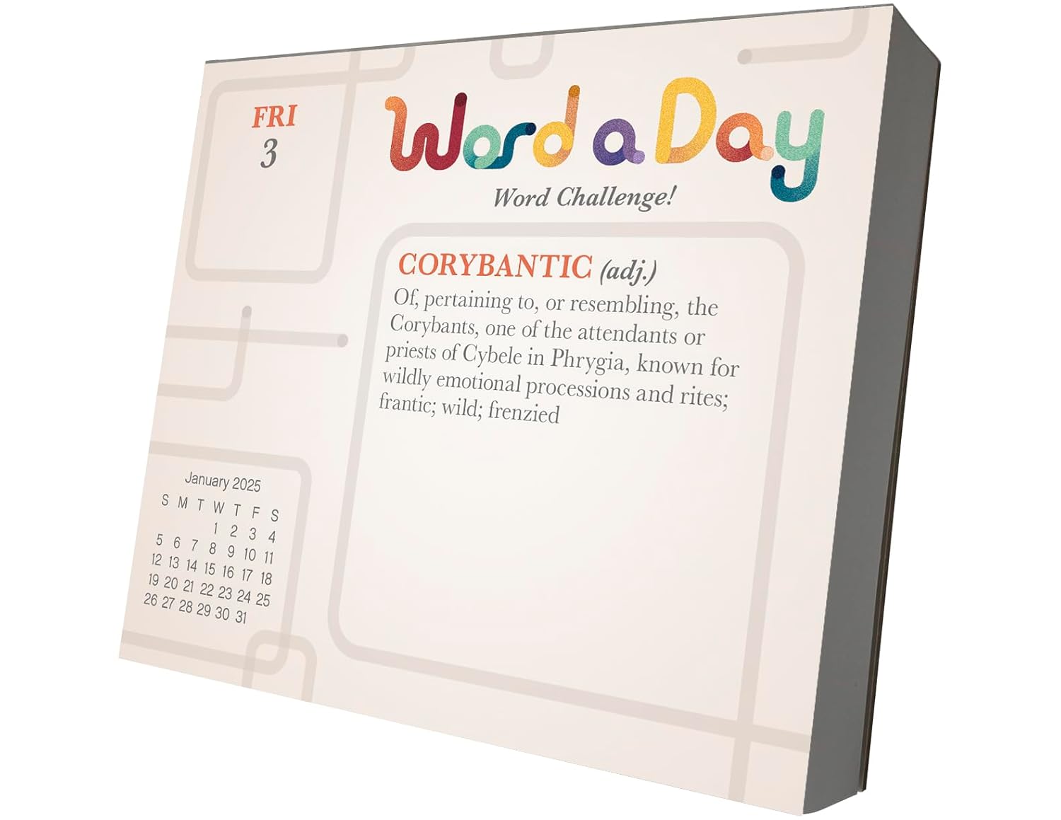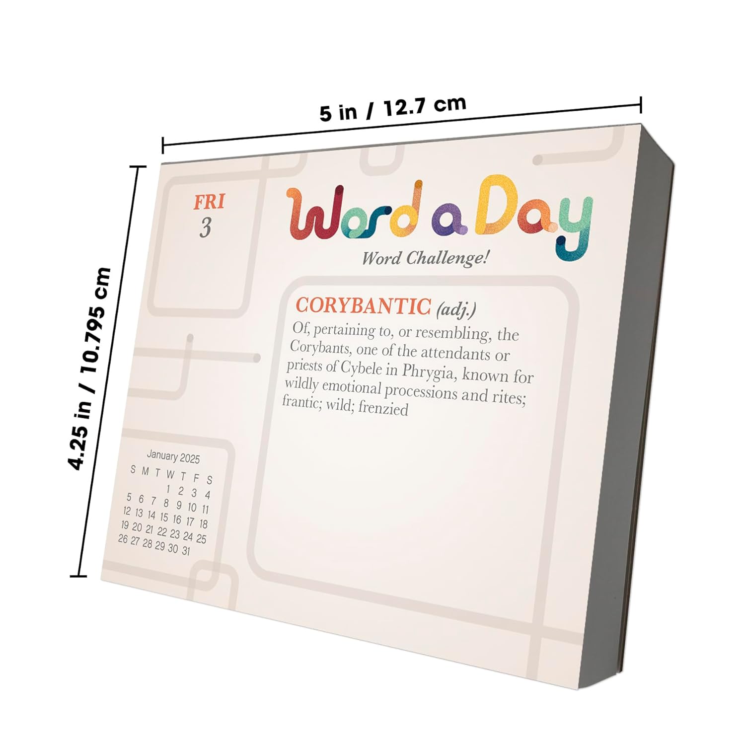 This 2025 Word a Day Day-at-a-Time Box Calendar features full-color, tear-off pages with unique content on every pageIncludes more than 300 pages for every day of the year with Saturday/Sunday combined to create weekend pagesEco-friendly, plastic-free easel makes it easy to display on a desk, table, or shelf at home, school, or the officeLanguage: EnglishCalendar Dimensions are 5″ x 4.25″ x 1″
