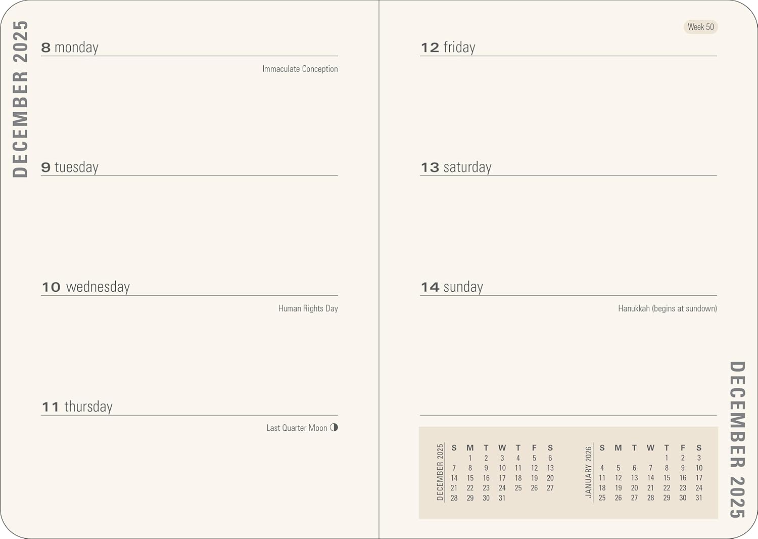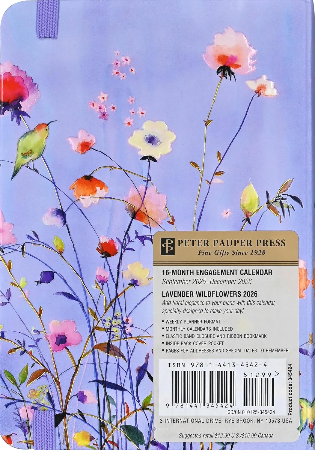 The weekly planner pages provide a 2-page spread with equal space for all 7 days, including Saturday and Sunday.You’ll find plenty of space to note appointments, events, to-dos, and weekend plans!The weekly pages also include mini reference calendars — 1 for the current month, and 1 for the month to come – to help in your planning.Major holidays, special observances, and moon phases are all noted for your reference.Monthly pages provide helpful overviews of the entire month, with space for notes.This planner covers September 2025 through December 2026, providing 16 months of use!So helpful for students, educators, and parents in planning the academic year.Extra pages in the back allow you to record information about your contacts, and to note important dates to remember.Thick, smooth-finish pages support pen or pencil.120 gsm paper resists ink bleed-through and feathering, keeping your plans neat and legible!Paper is acid-free and of archival quality, helping to prevent damage from air and light.Keep your place from week to week with the satin ribbon bookmark that matches the cover design.An elastic closure is also provided to secure your planner.You’ll also find an inside back cover pocket that expands to hold notes, business cards, and other flat items.Sturdy hardcover binding lasts and lasts. Planner covers are rounded to prevent corner bumping and extra wear.The cover design depicts delicate florals, a hummingbird among them, embossed and embellished with hand-selected touches of gold foil and gloss highlights. So pretty!Lightweight calendar measures 5” wide x 7” high and fits easily in most purses, bags, and backpacks. Keep those plans on hand wherever you go!Whether for work, home, or school — plan ahead and write it down with a calendar that offers 16 months of functionality! Stay on track and achieve those goals!