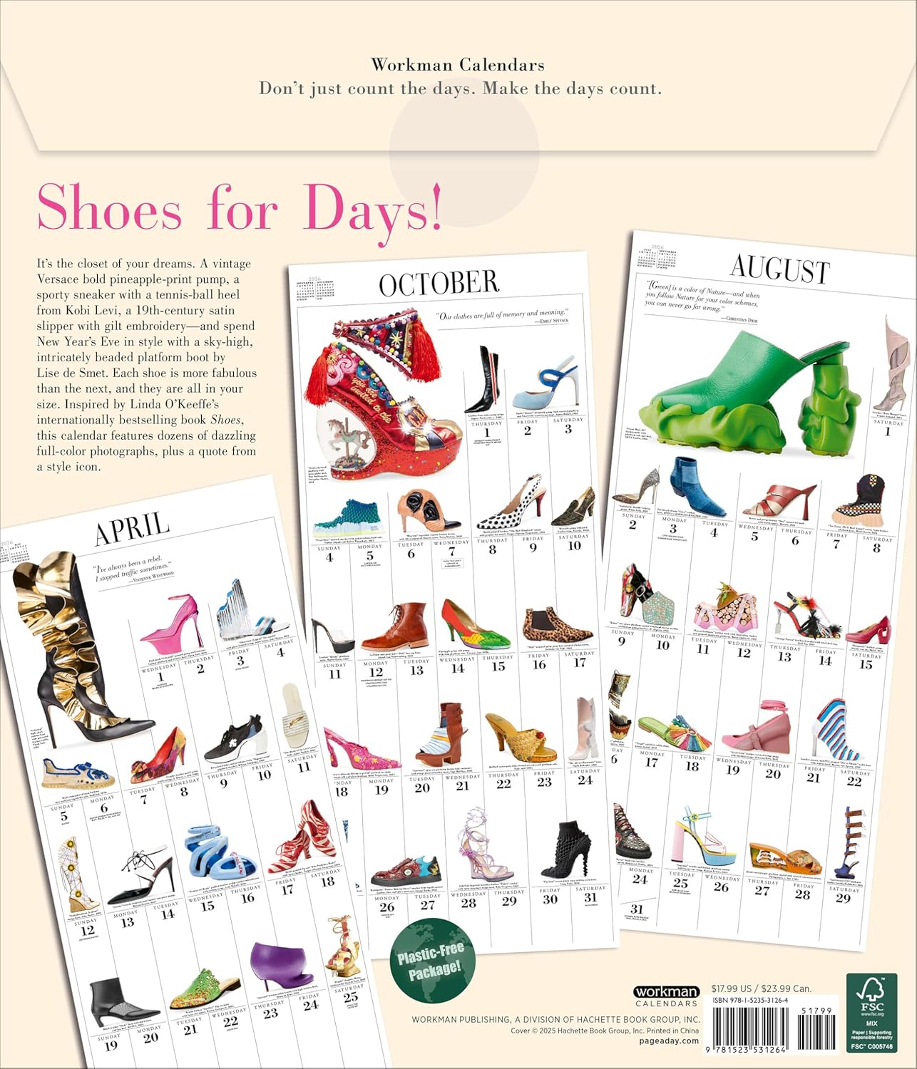 FEED THE FOOTWEAR OBSESSION: A closet full of shoes in a 12” x 14” calendar. Slides, pumps, sneakers, mules, stilettos, and more every month. PICTURE-A-DAY FORMAT: Each month features a beautiful, large full-color photograph at the top, plus dozens more throughout the grid, and a delightful quote from a style icon. GLAMOROUS GIFT: Ideal for fashionistas, shopaholics, and other fabulous shoe lovers—it’s like a new closet every month! NOW PLASTIC-FREE!: Workman wall calendars are completely plastic-free! Now printed with an extended paper flap closed with a fully recyclable seal—no more shrink-wrap!