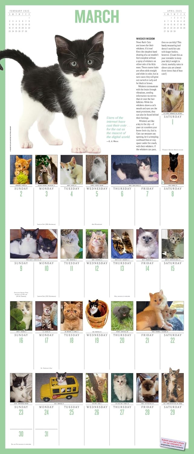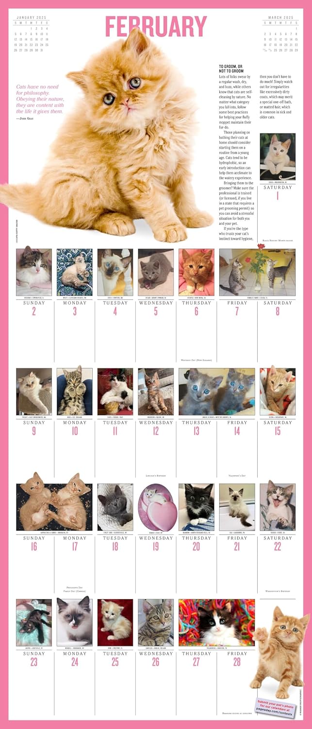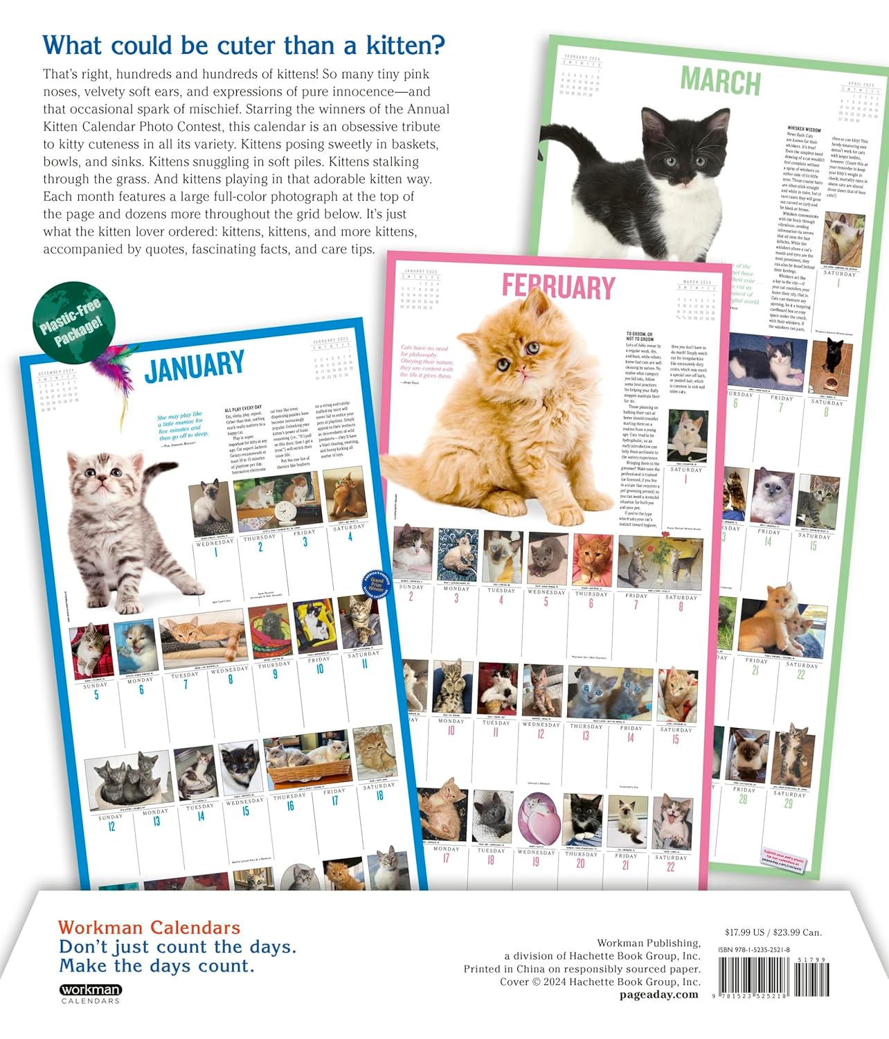 KITTY CUTENESS: No other calendar on the market features more tiny pink noses, velvety soft ears, or mischievously sweet expressions. And they’re all winners of our Annual Kitten Calendar Photo Contest! FELINE FUN: Each month features a large full-color photograph at the top of the page and dozens more throughout the grid, plus kitten quotes, fascinating facts, and tips for caring for your cat. GREAT GIFT: Ideal for kitten lovers and cat owners! The 12” x 14” oversized format makes for a year packed with the sweetest kittens we could find. NOW PLASTIC-FREE!: For 2025, Workman Calendars are completely plastic-free. All wall calendars are now printed with an extended paper flap closed with a fully recyclable seal – no more shrink wrap!