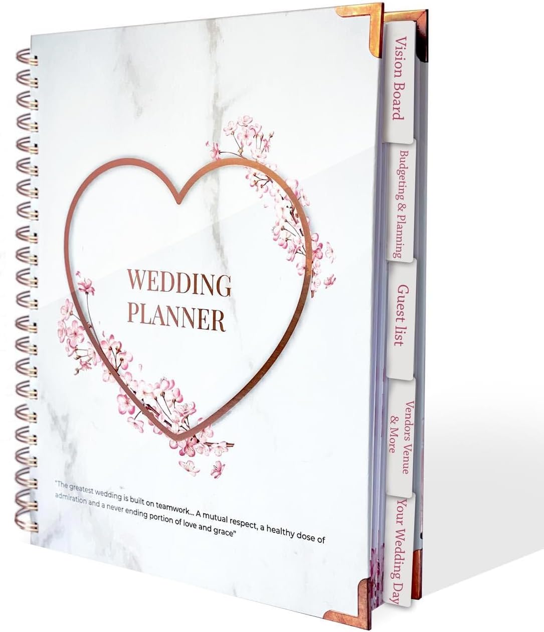 TABBED SECTIONS: Bizzon wedding planner book includes various topics like “The Wedding Vision, Budgeting & Planning Your Wedding, a Guest List with a seating chart, Vendors, Venues, The Day of Your Wedding” & more