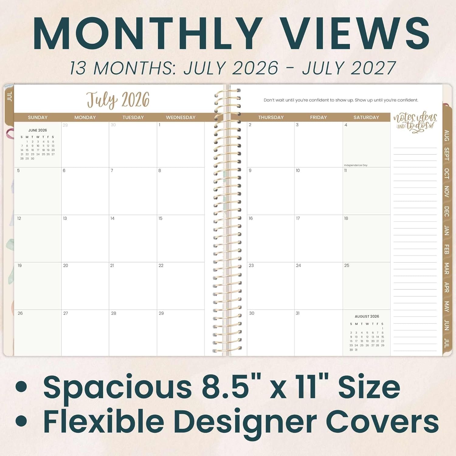 8.5” x 11” WITH HORIZONTAL WEEKLY LAYOUT & MONTHLY VIEWS: 2 page monthly overview spreads and spacious weekly views run Academic Year, July 2026 through July 2027. Weekly views are horizontal and include priority & habit tracking.