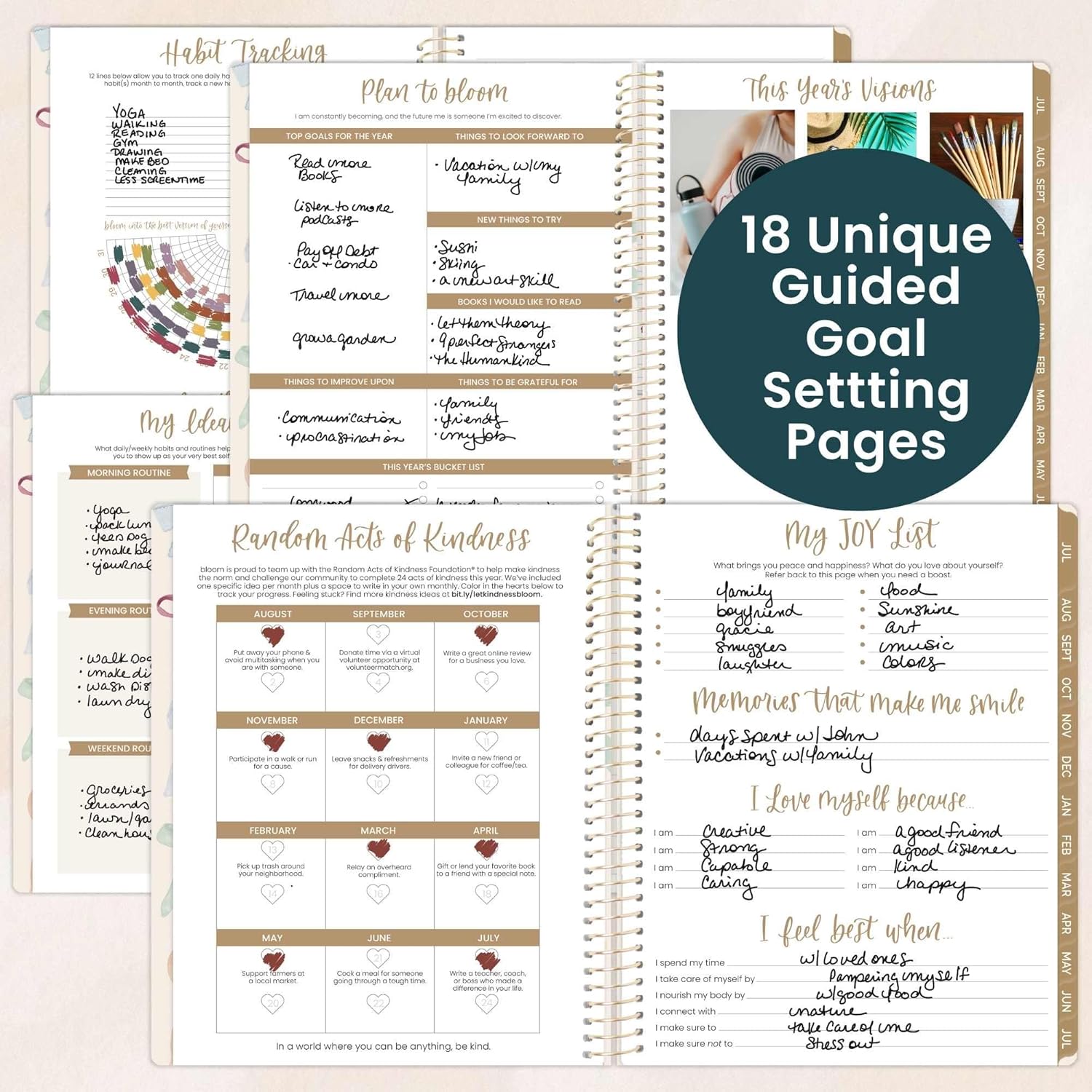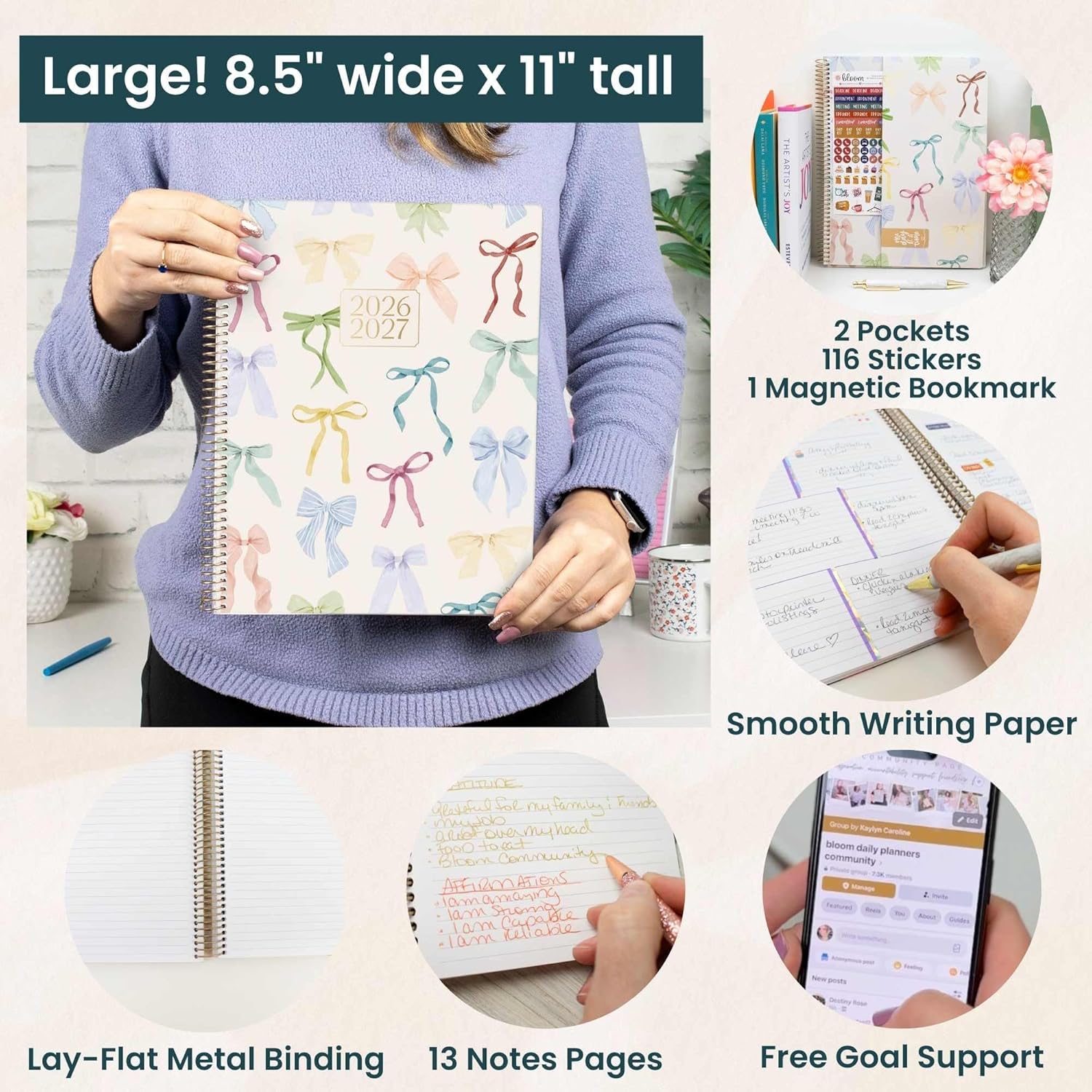 PREMIUM FEATURES: Soft, lightweight covers made from thick cardstock with gloss film lamination, monthly tabs, upgraded 110gsm bright white bleed-resistant paper, recyclable metal lay-flat spiral binding, vertical front and back inside storage pockets, and FREE magnetic bookmark and stickers now included!