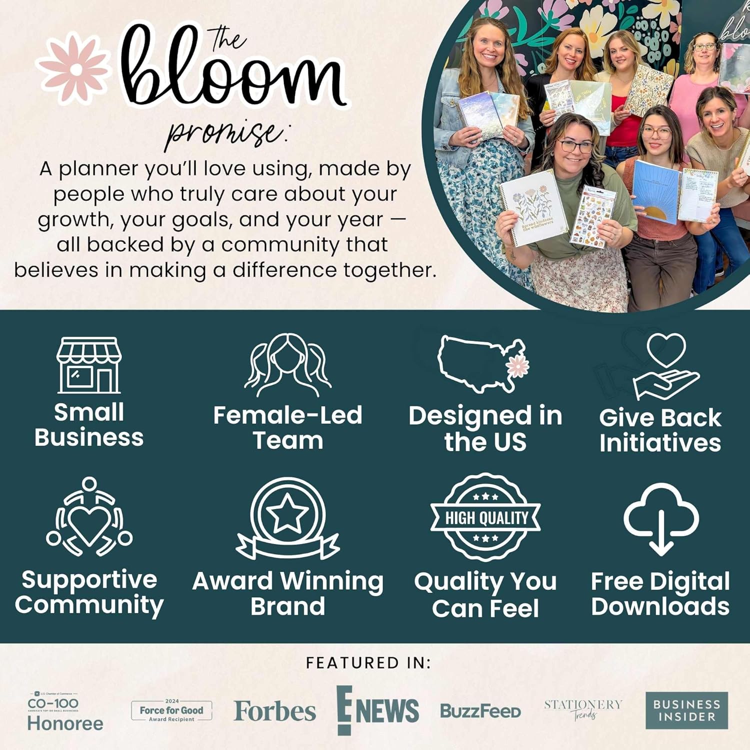 COMMITMENT TO GIVING BACK: bloom is a small, female-founded, socially conscious brand recognized as a U.S. Chamber of Commerce Top 100 Small Business. Every purchase helps support meaningful giveback initiatives.