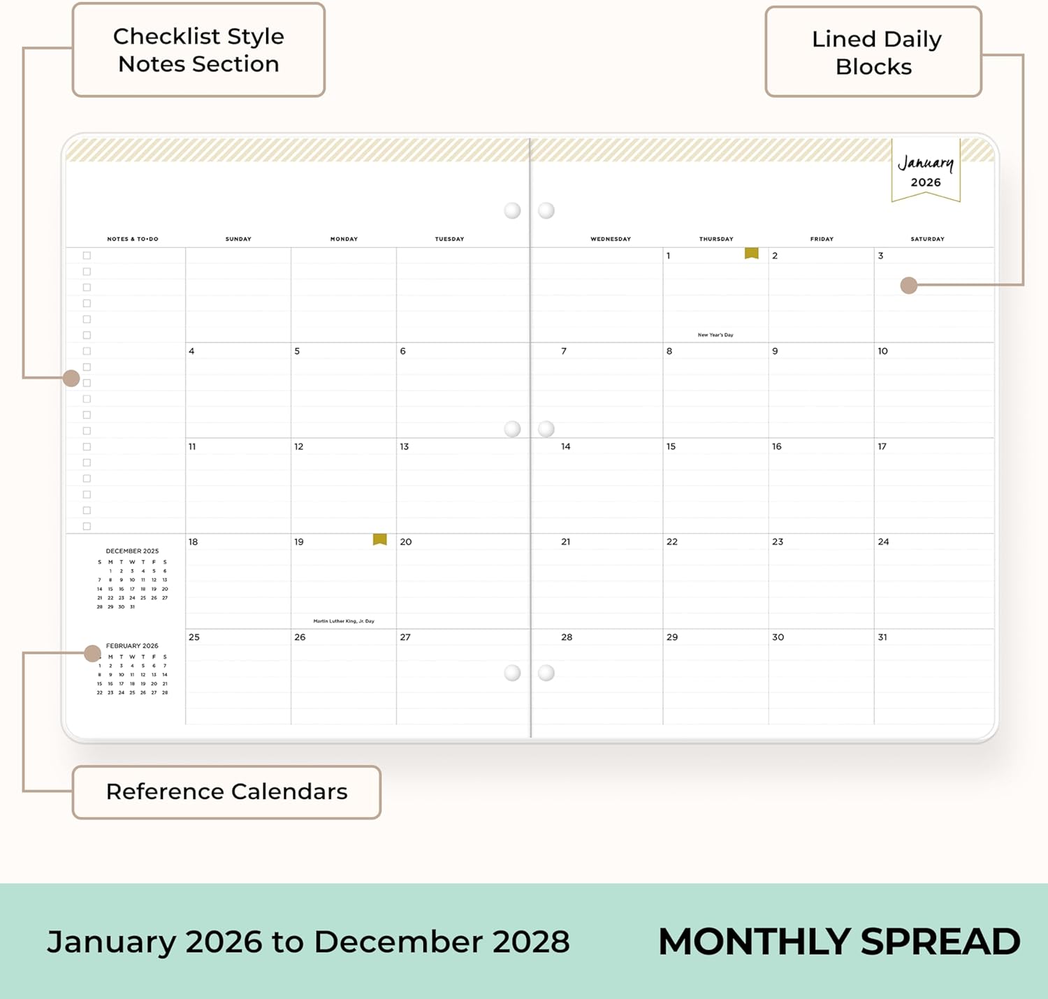 [BUILT TO LAST] Designed with a flexible cover and premium pages that endure daily use while maintaining a sleek, professional look. Includes 3 hole punched pages to easily fit inside a binder. Printed on quality FSC-certified paper that is durable enough to handle daily use throughout the year