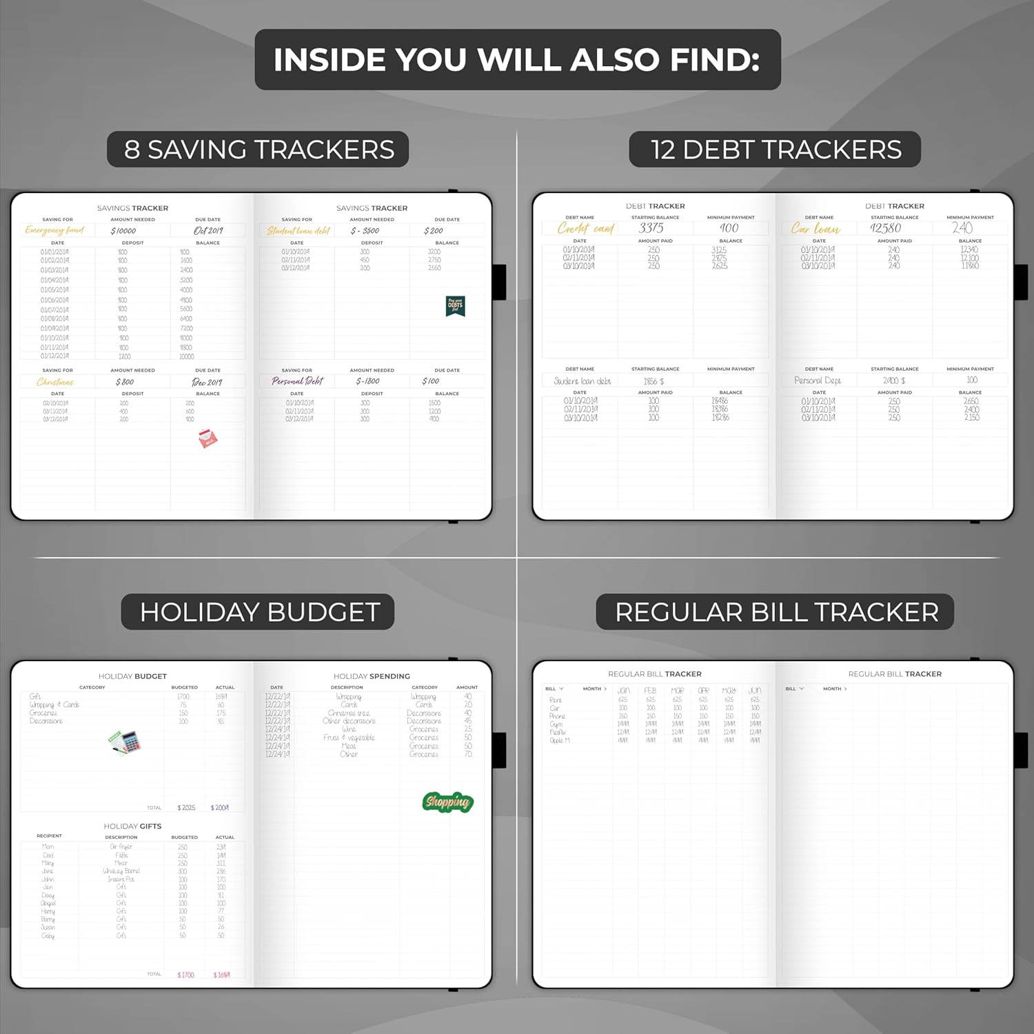 Effortlessly Manage Spending, Debts, and Savings – This 12-month finance planner features an undated format with monthly calendars, budget plans, expense trackers, 8 savings and 12 debt trackers.