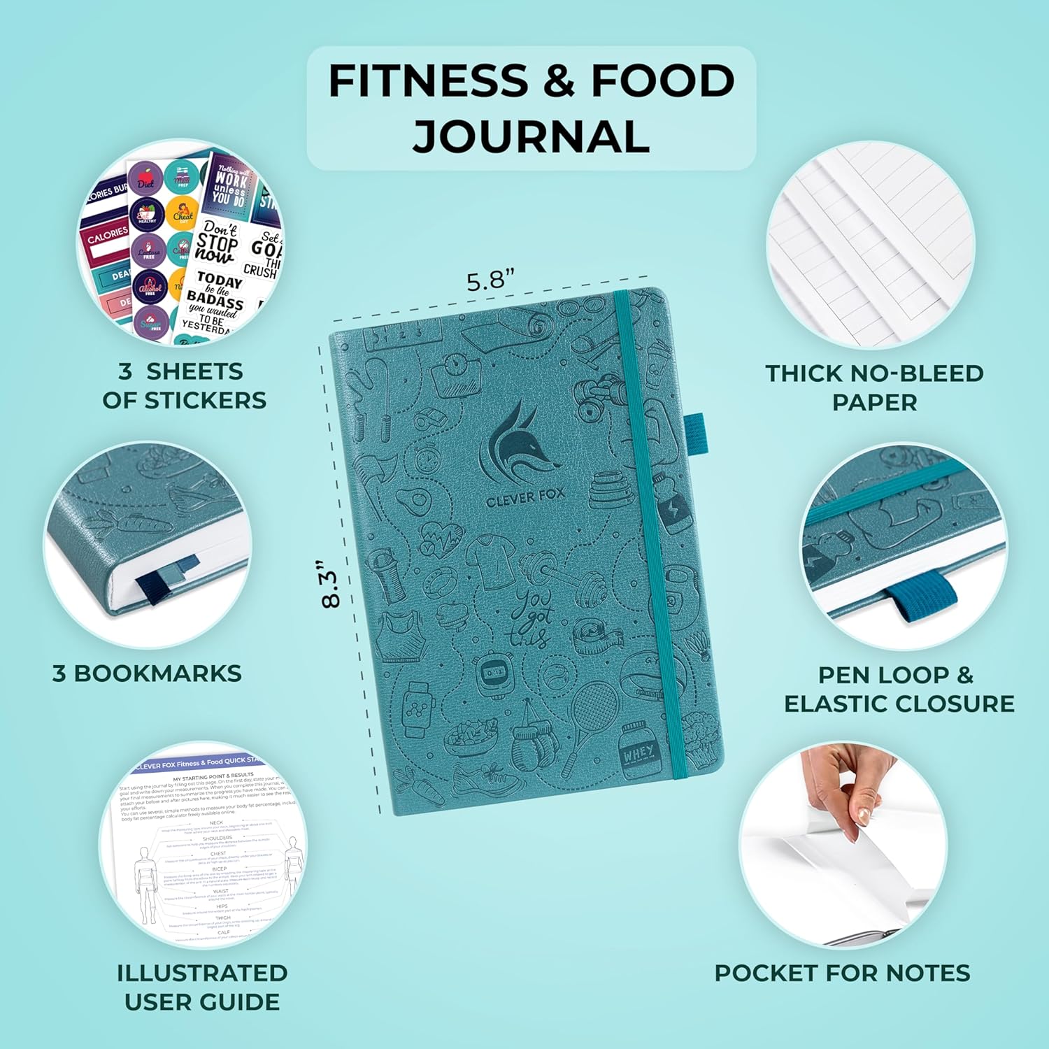 Clever Fox Fitness & Food Journal – Nutrition & Workout Planner for Women & Men – Diet & Gym Exercise Log Book with Calendars, Diet & Training Trackers – Undated, A5 Size, Hardcover (Aquamarine)