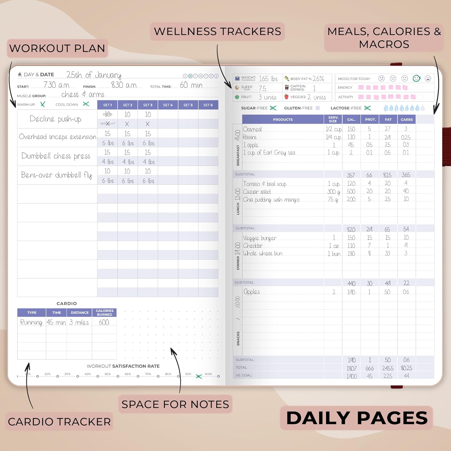 A5 SIZE, STICKERS & USER GUIDE: This food & exercise journal comes in A5 size (5.5×8.3”). The diet & gym notebook is undated, has a vegan leather hardcover, 120gsm paper, pen loop, elastic, lay-flat binding, 3 bookmarks, stickers, and user guide.