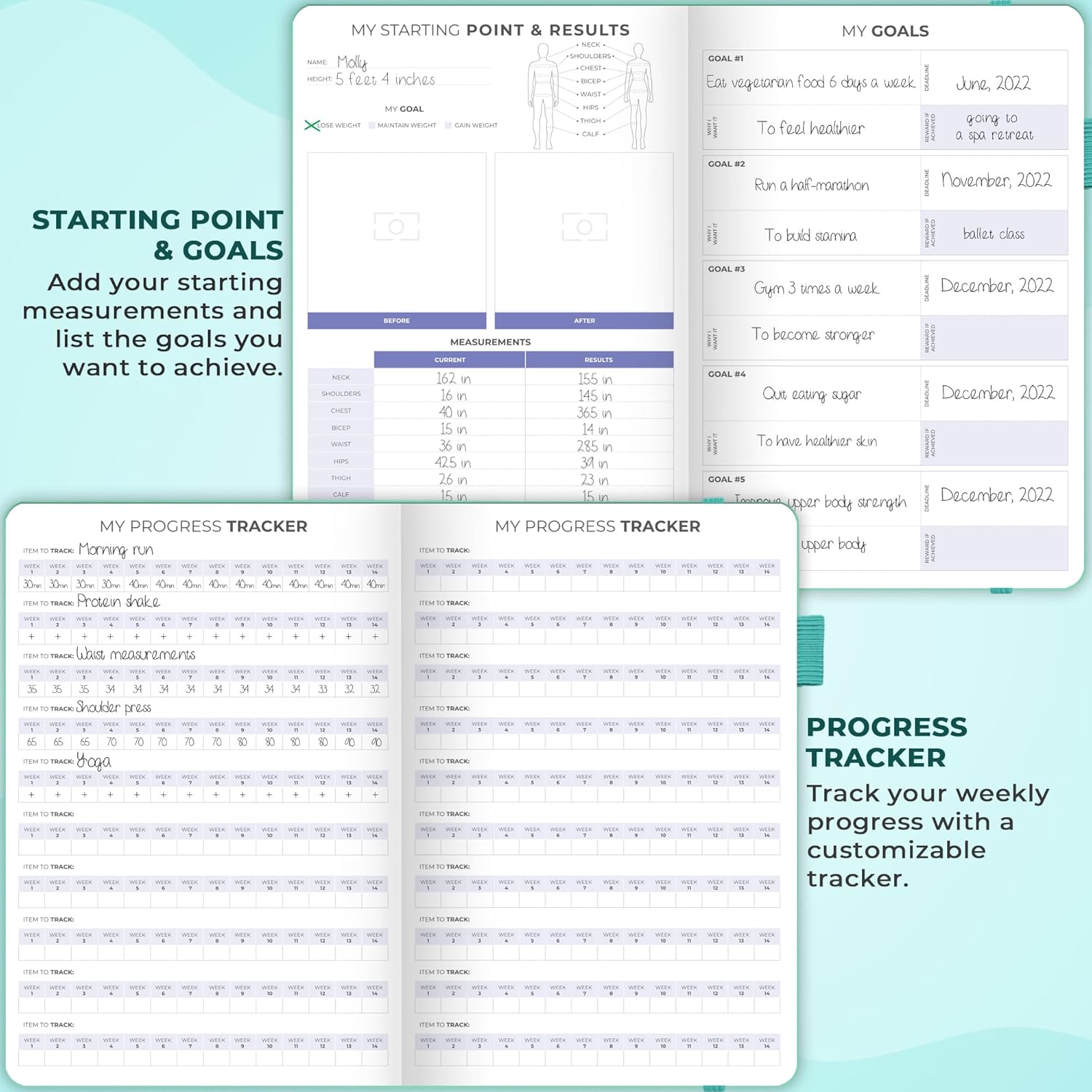 PLAN, ACHIEVE, REFLECT, REPEAT: This fitness and nutrition journal helps you set big goals, break them into monthly milestones and work on them consistently. At the end of each month, you will complete a monthly review to reflect on your progress.