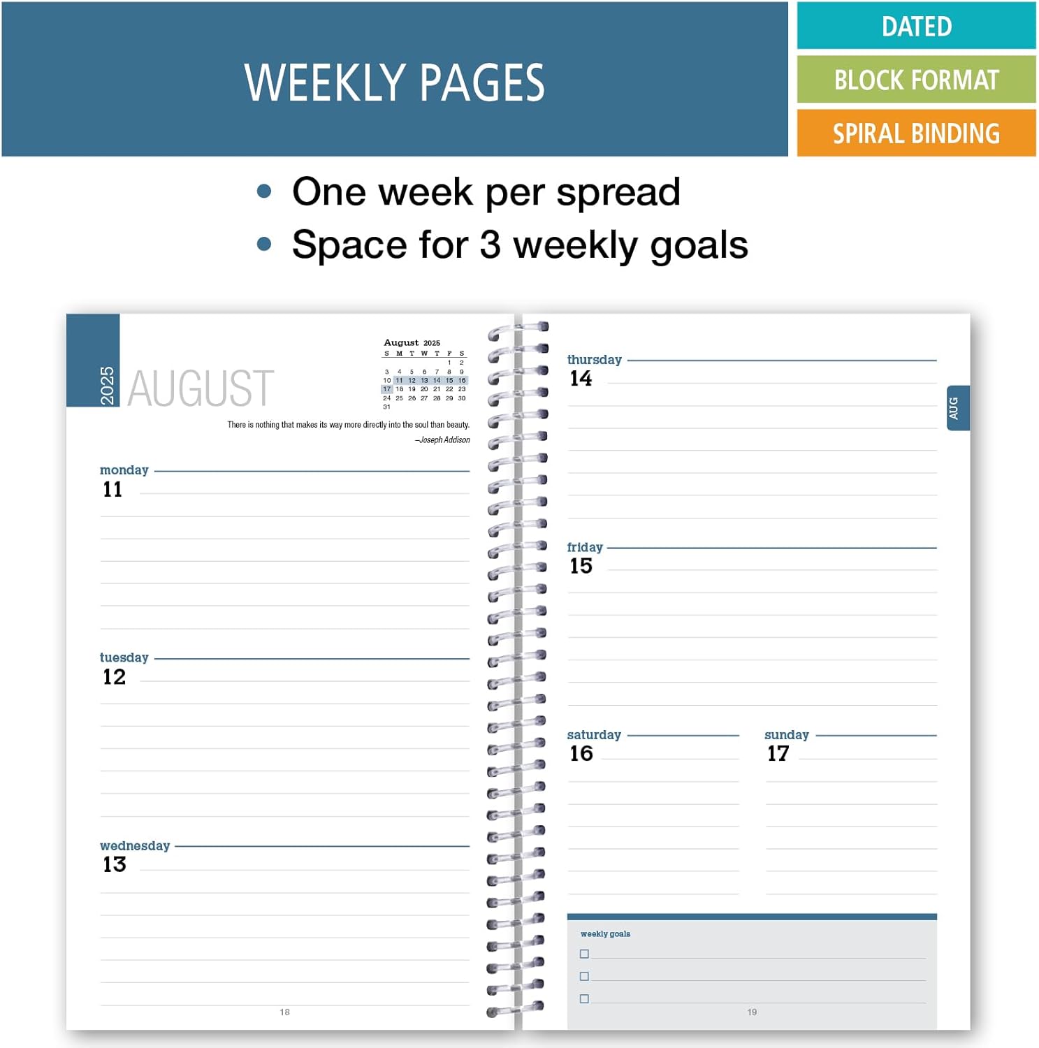 Weekly planner, dated August through July, one week across two facing pages (Monday-Sunday)