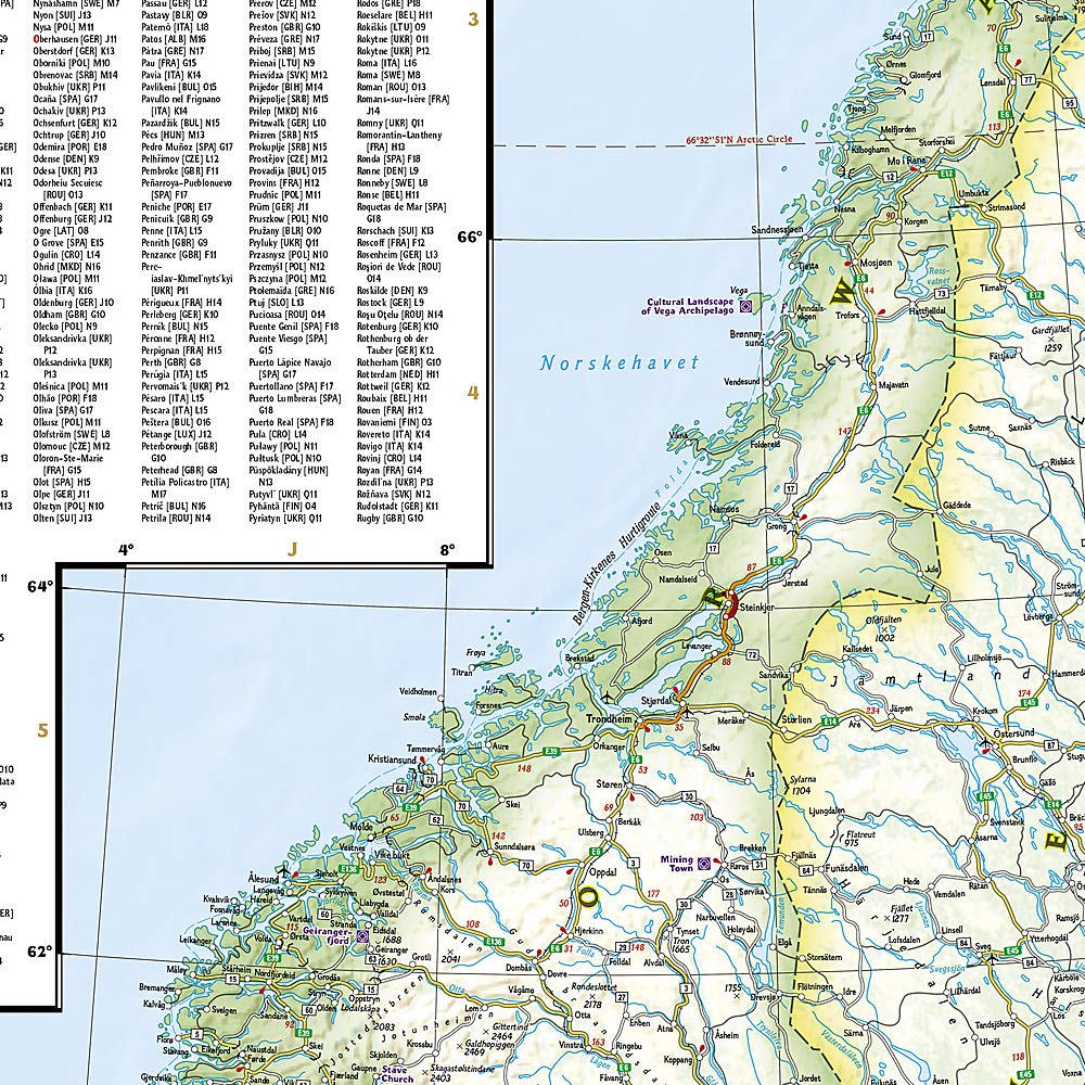 The north side of the printed map includes the northern extents of Europe including Scandinavia, Finland and Iceland. The southern side of the printed map includes the majority of mainland Europe and the countries of the Mediterranean with each country highlighed in its own color. Major roads and ferry routs help you navigate this densely populated continent with thousands of towns from mega-cities such as London and Paris to small towns in the hinterlands of Bulgaria.