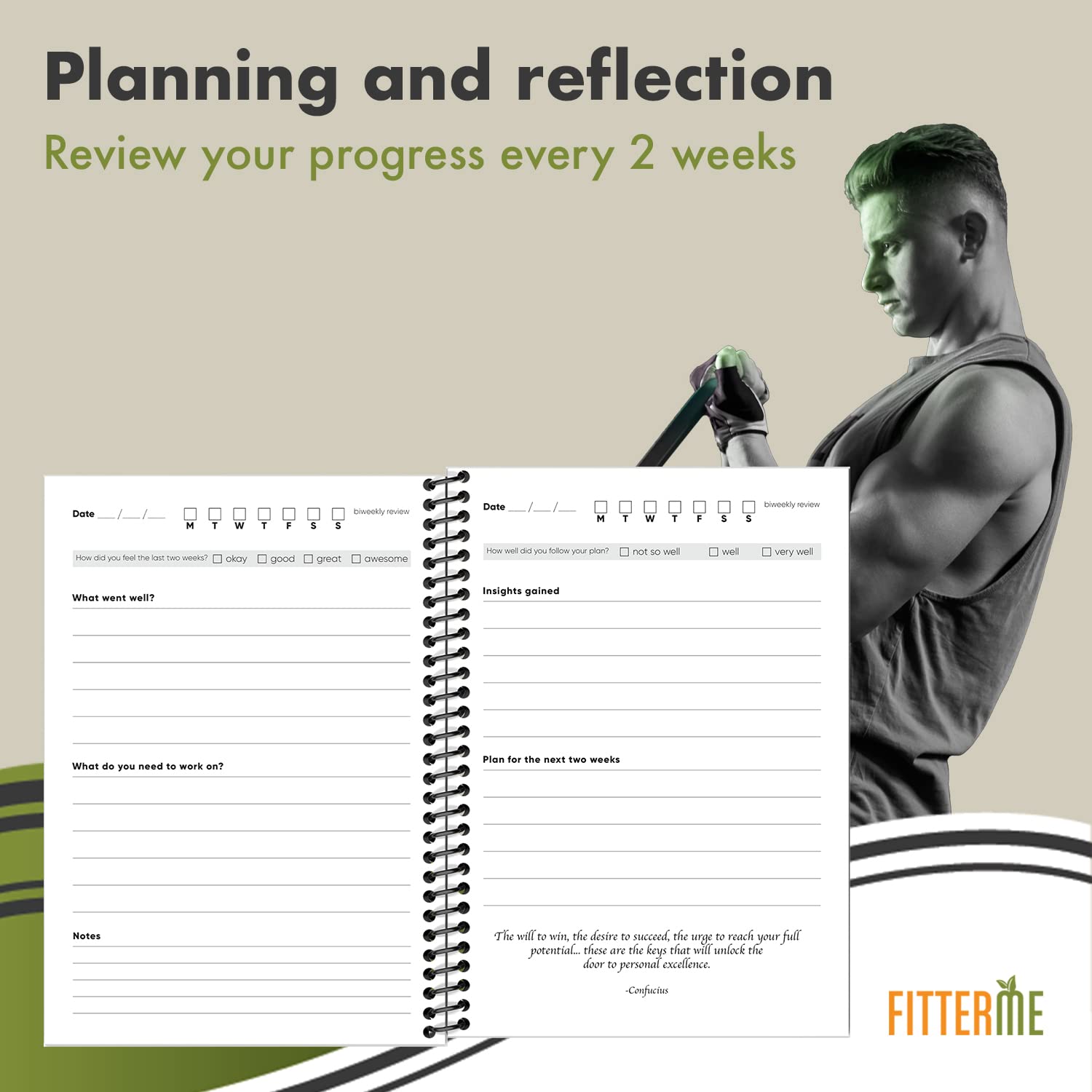 Our diary contains a review page every two weeks. This allows you to pause, reflect, and see how far you have come. The review page is important for measuring your progress to date and planning ahead to ensure success in reaching your fitness and nutrition goals.