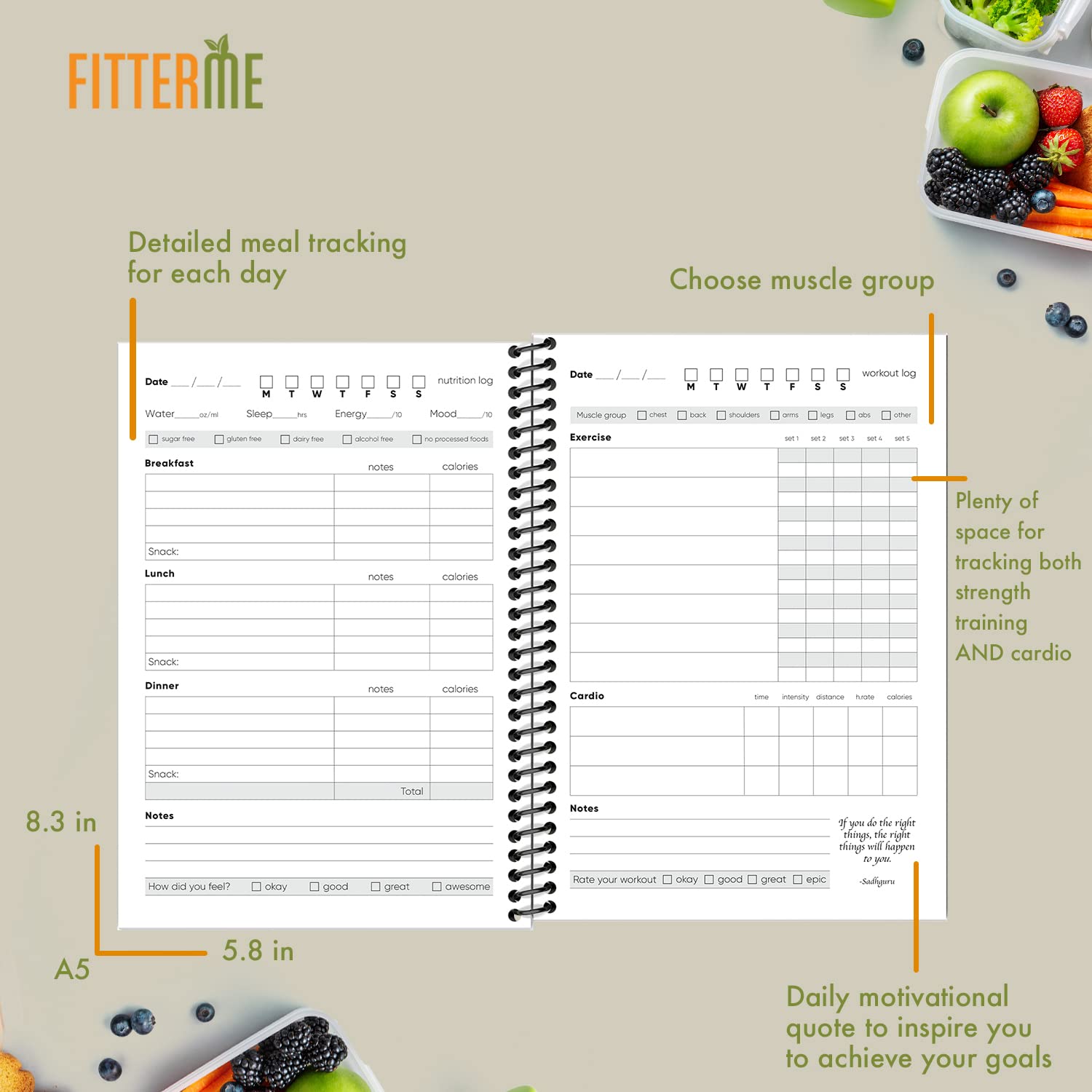 Our fitness journal for women and men has a laminated cover and sturdy spiral binding to ensure it won’t fall apart. It’s durable and sturdy, with no upside down or stuck-together pages.