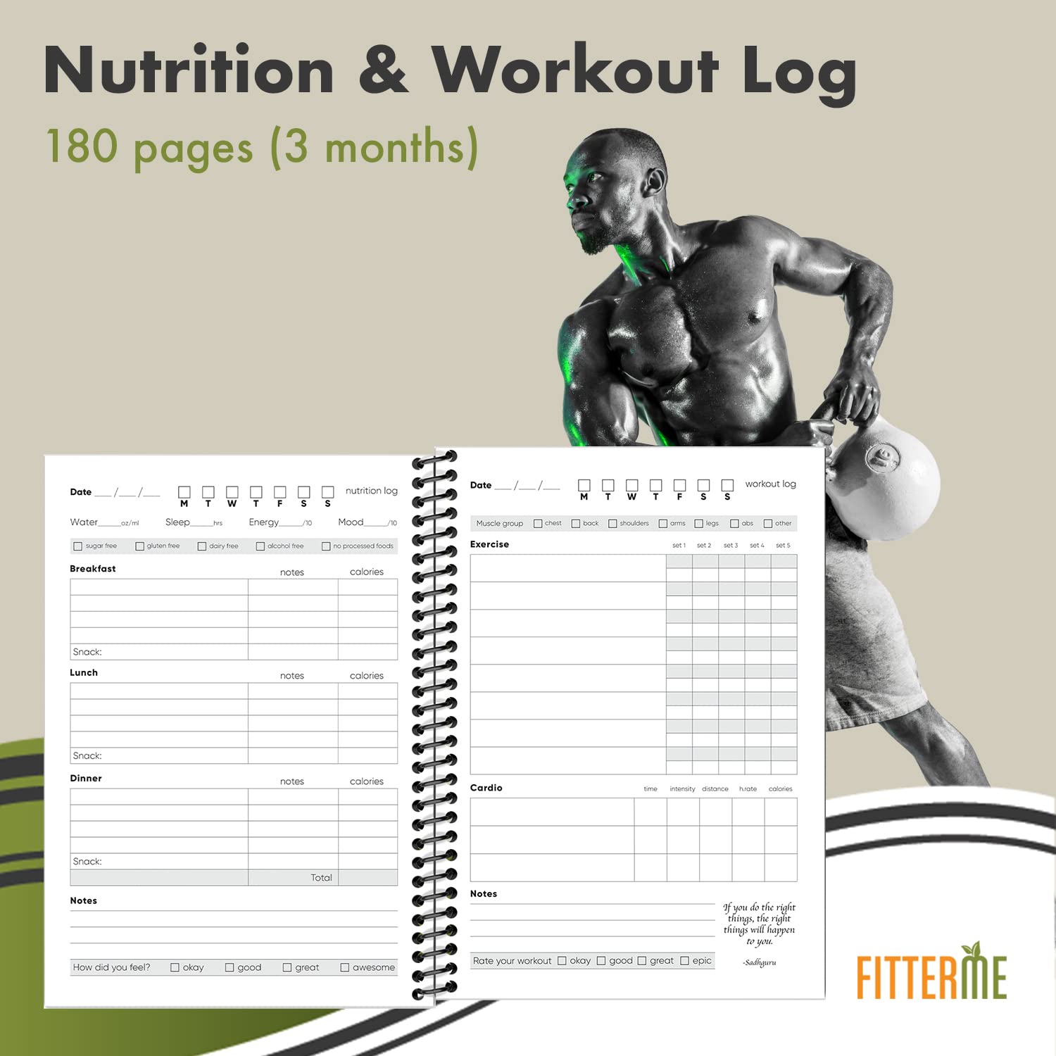 Easily track your eating, exercise, lifting and training. The layout that we have designed is simple and uncomplicated, ensuring that you meet your goals. Each day provides space for logging your meals, diet, energy level, mood, water intake, sleep, strength workouts (including muscle group), and cardio. There are notes sections as well for additional information.