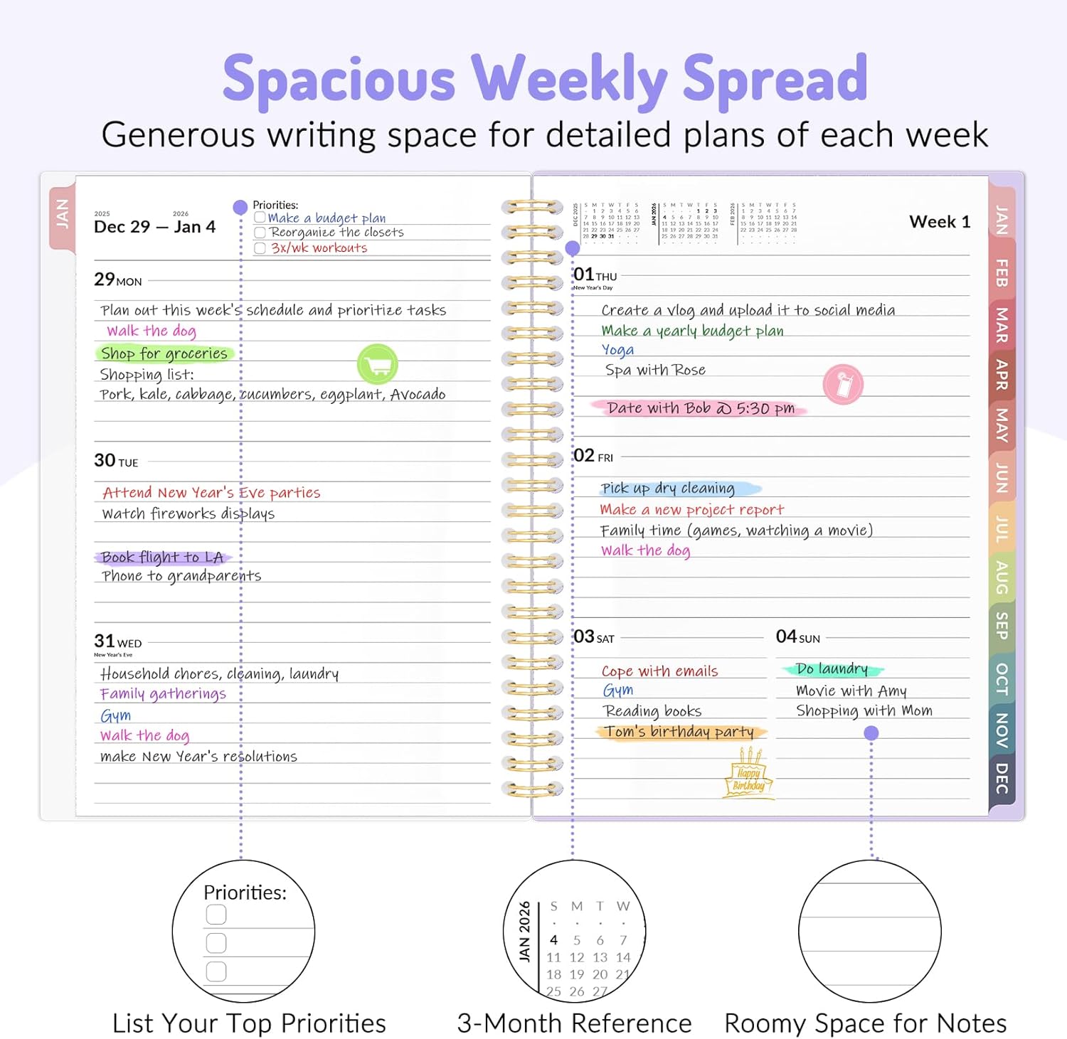 Colored Tabs for Easy Navigating: The monthly tabs make it easy to jump where you need to go when you flip it open—a good design for busy people, student teacher who want to track things day by day.