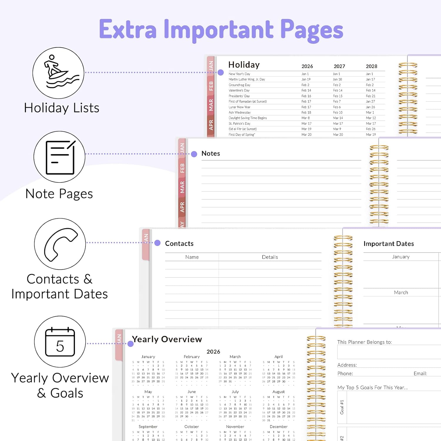 Contact pages, important dates and holiday lists help you keep oraganized.