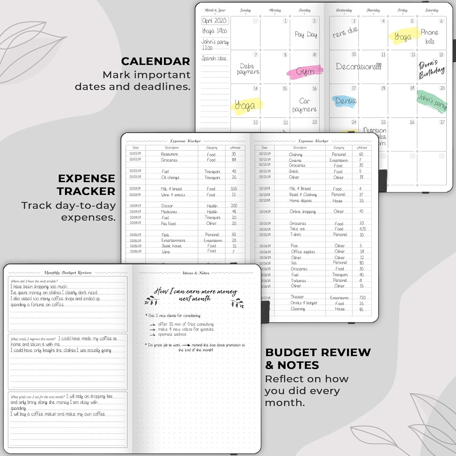 PERSONAL FINANCE & BUDGETING MADE EASY – Each month, set monthly goals, add reminders of upcoming purchases, bills and payments, make a monthly budget, and track your spending using a dedicated expense tracker.