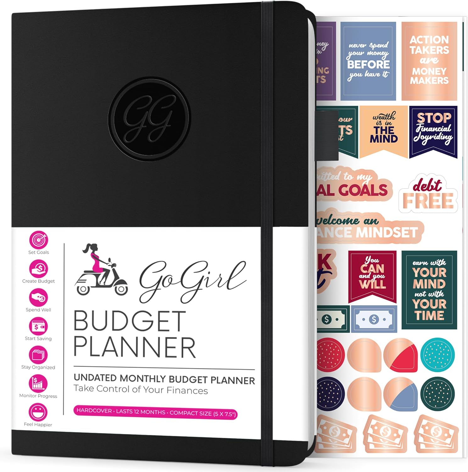 GoGirl budget tracker notebook features: Undated layout – start anytime and take a break when needed 2 colorful bookmarks – effortlessly navigate through the pages Inner pocket for bills and receipts – keep them safe in one place Complimentary sticker sheet – budget in style High-quality leatherette cover – keeps your planner safe 120gsm pearl white paper – no bleeding through Elastic planner band – keeps expense planner closed Pen loop – never forget your pen!