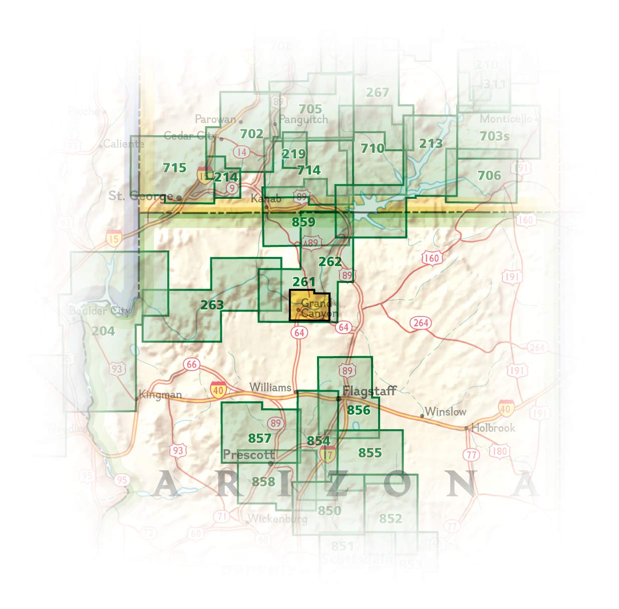 Other features found on this map include: Grand Canyon National Park, Kaibab National Forest, Little Colorado River, Marble Canyon.