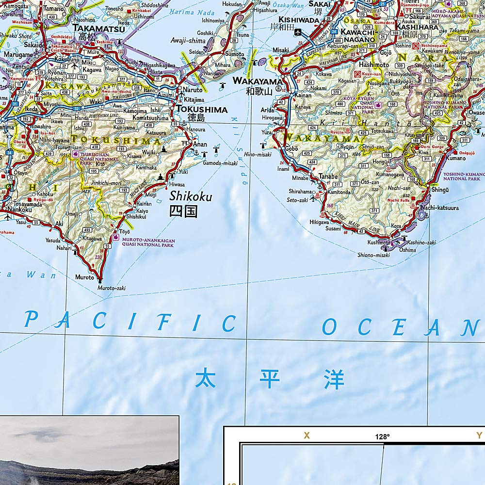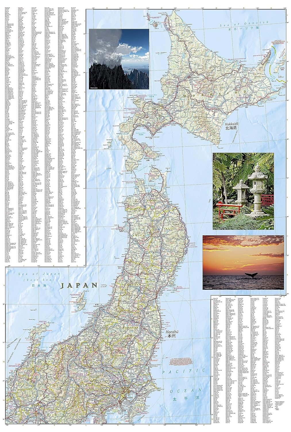 Hundreds of highlighted cultural, historical and recreational points of interest, including UNESCO World Heritage Sites, National Parks, botanical gardens, castles, churches, Buddhist temples, Shinto shrines, caves, waterfalls, hot springs, ski area and beaches, will guide you to popular tourist hot spots as well as to hidden gems away from major tourist hubs. Cities and towns can be easily found with the help of a clear and convenient index. A road network complete with distances and designations for motorways, expressways, major roads and secondary roads, will help find select a suitable route, including one off the beaten path. Other transportation features include airports, ferries routes, harbors, railroads and high-speed trains.