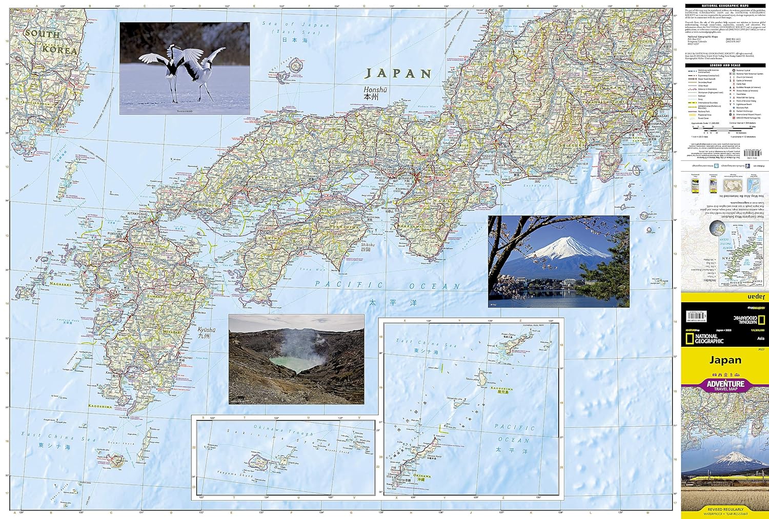 Explore the Land of the Rising Sun with National Geographic’s expertly researched Japan Adventure Map. The user-friendly design combined with unparalleled detail provides adventure travelers the ultimate tool for exploring this island nation. Coverage includes the four main islands of Hokkaido, Honshu, Shikoku and Kyushu, as well as the southeastern tip of the Korean Peninsula. Inset maps cover Okinawa and many of the other Ryukyu Islands. Some popular destinations include the cities of Tokyo, Kyoto and Nara, Mount Fuji, the Hiroshima Peace Memorial and Himeji Castle. The map is the perfect compliment to National Geographic’s Japan Traveler Guide or any other guidebook.