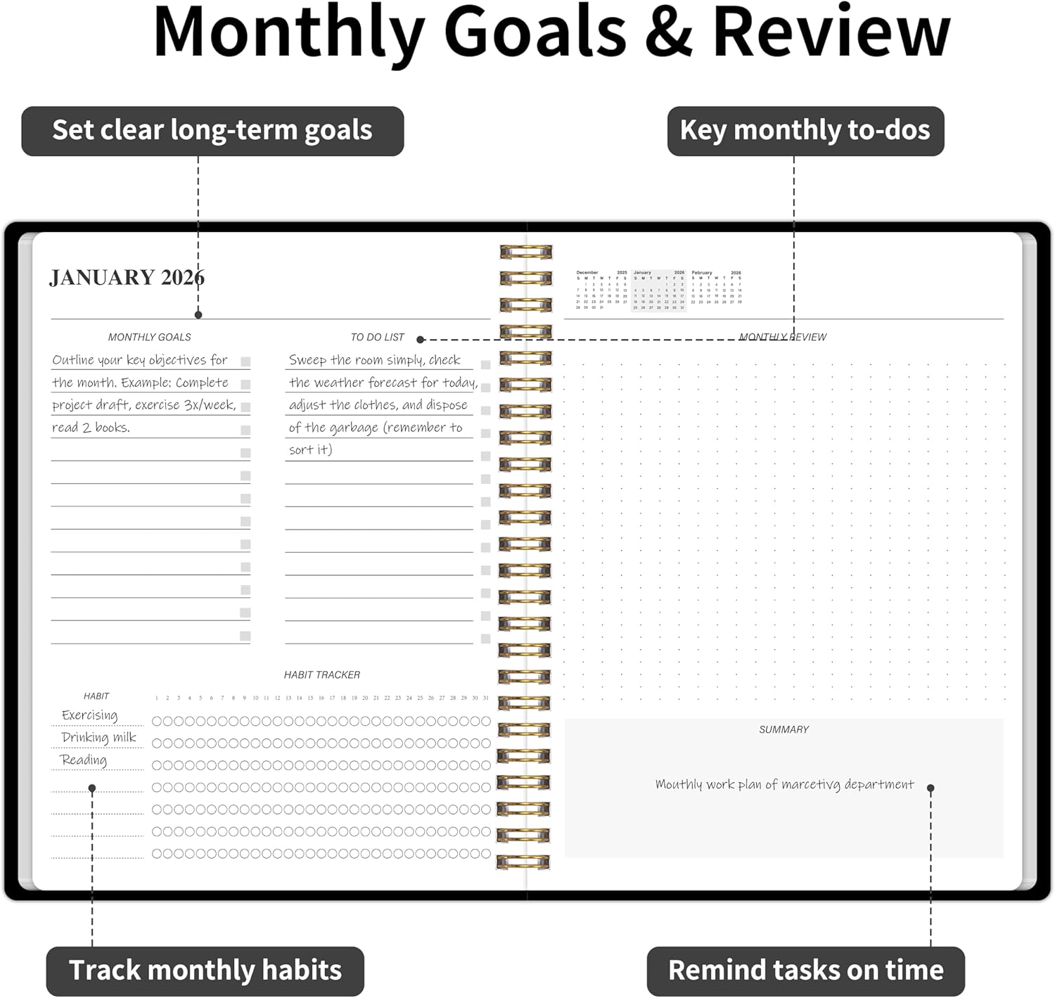 Smart Spiral-Bound Design:User-friendly features include:✔ Ample writing space for daily planning ✔ Monthly goals & to-do lists ✔ Yearly overview & reflection pagesIdeal for work, school, or personal organization!