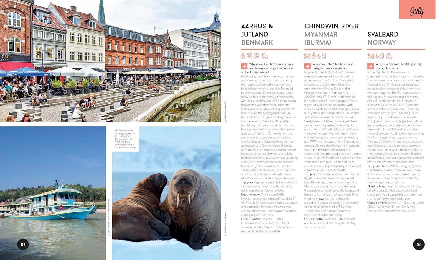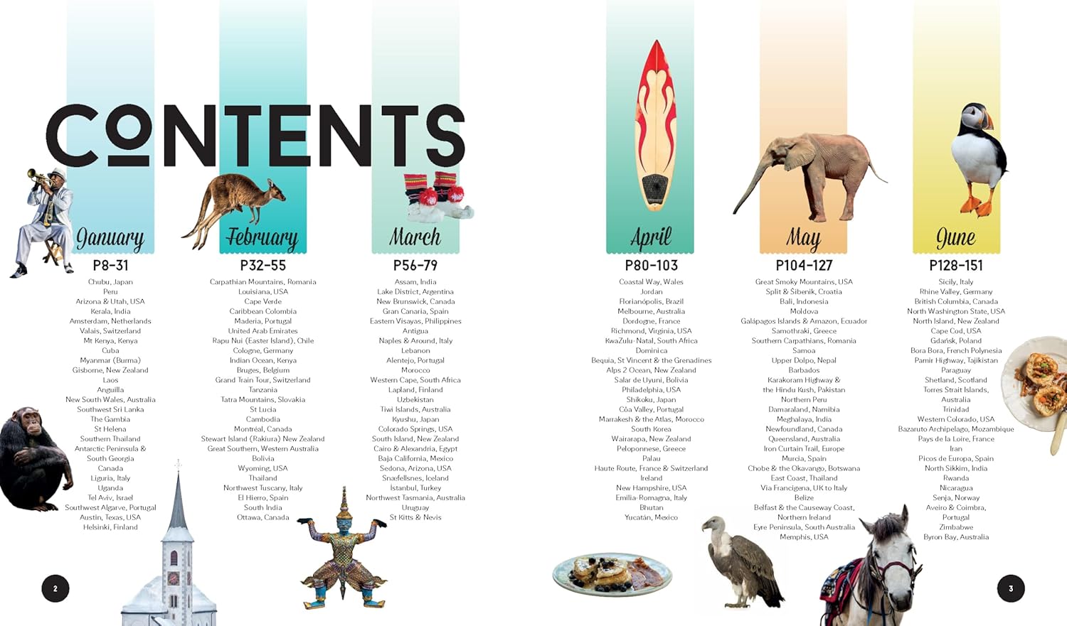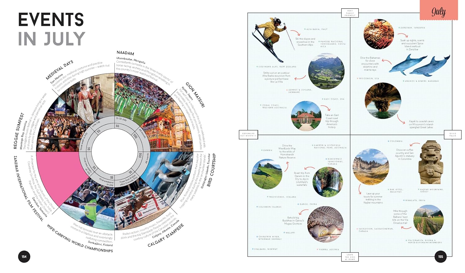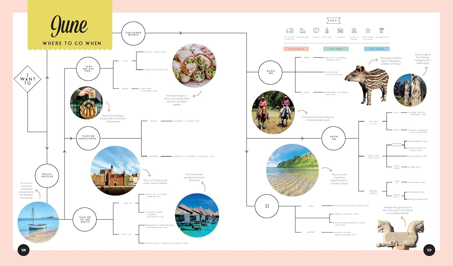 25 destinations for each month of the year that cover every corner of the globeHandy decision-making flowcharts so you can choose your next trip based on your travel passions and the activities that appeal to you the most Special monthly events, festivals and celebrations calendarIntuitive keys and colour coding that suggest ideal trip length: short break, one week, two weeks +Amazing experiences for all interests: wildlife & nature, adventure, value, culture, journey, food & drink, personal growth, relaxationTop budgeting tips in clear grids and diagrams so you can get the most out of your moneySuper family friendly breaks and experiences plus suggestions on when to leave the kids at home