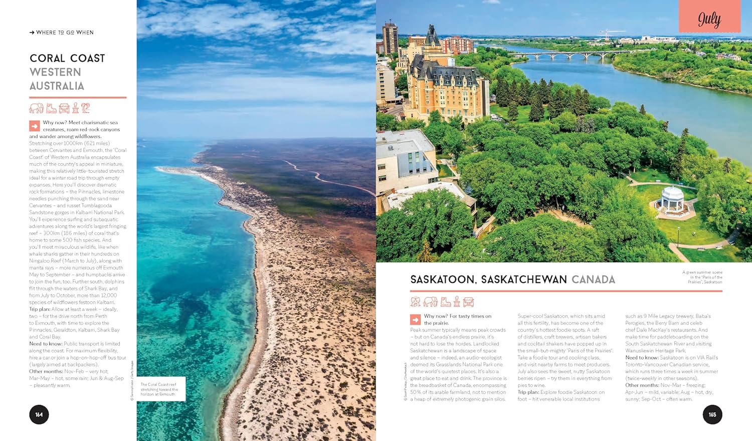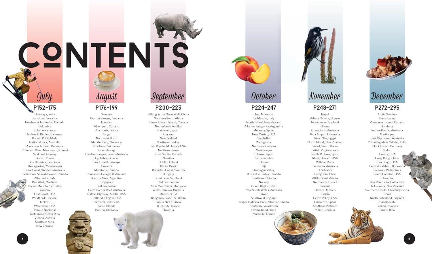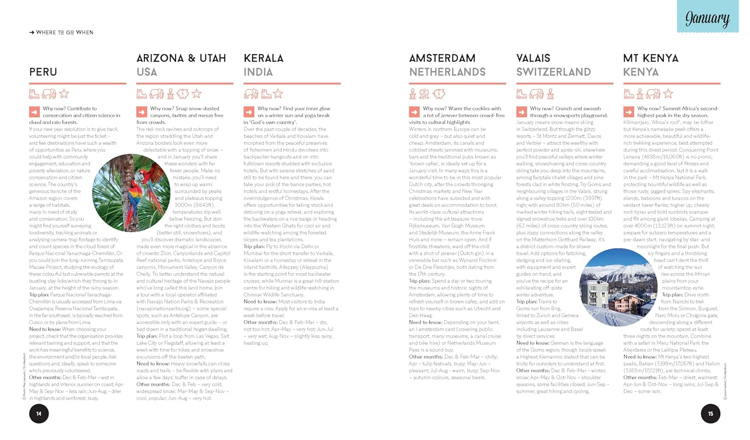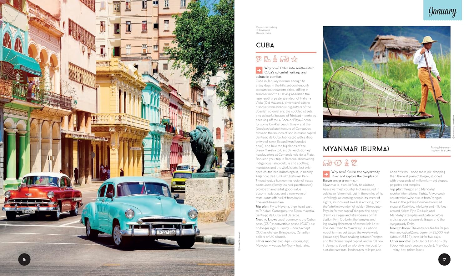 25 destinations for each month of the year that cover every corner of the globeHandy decision-making flowcharts so you can choose your next trip based on your travel passions and the activities that appeal to you the most Special monthly events, festivals and celebrations calendarIntuitive keys and colour coding that suggest ideal trip length: short break, one week, two weeks +Amazing experiences for all interests: wildlife & nature, adventure, value, culture, journey, food & drink, personal growth, relaxationTop budgeting tips in clear grids and diagrams so you can get the most out of your moneySuper family friendly breaks and experiences plus suggestions on when to leave the kids at home