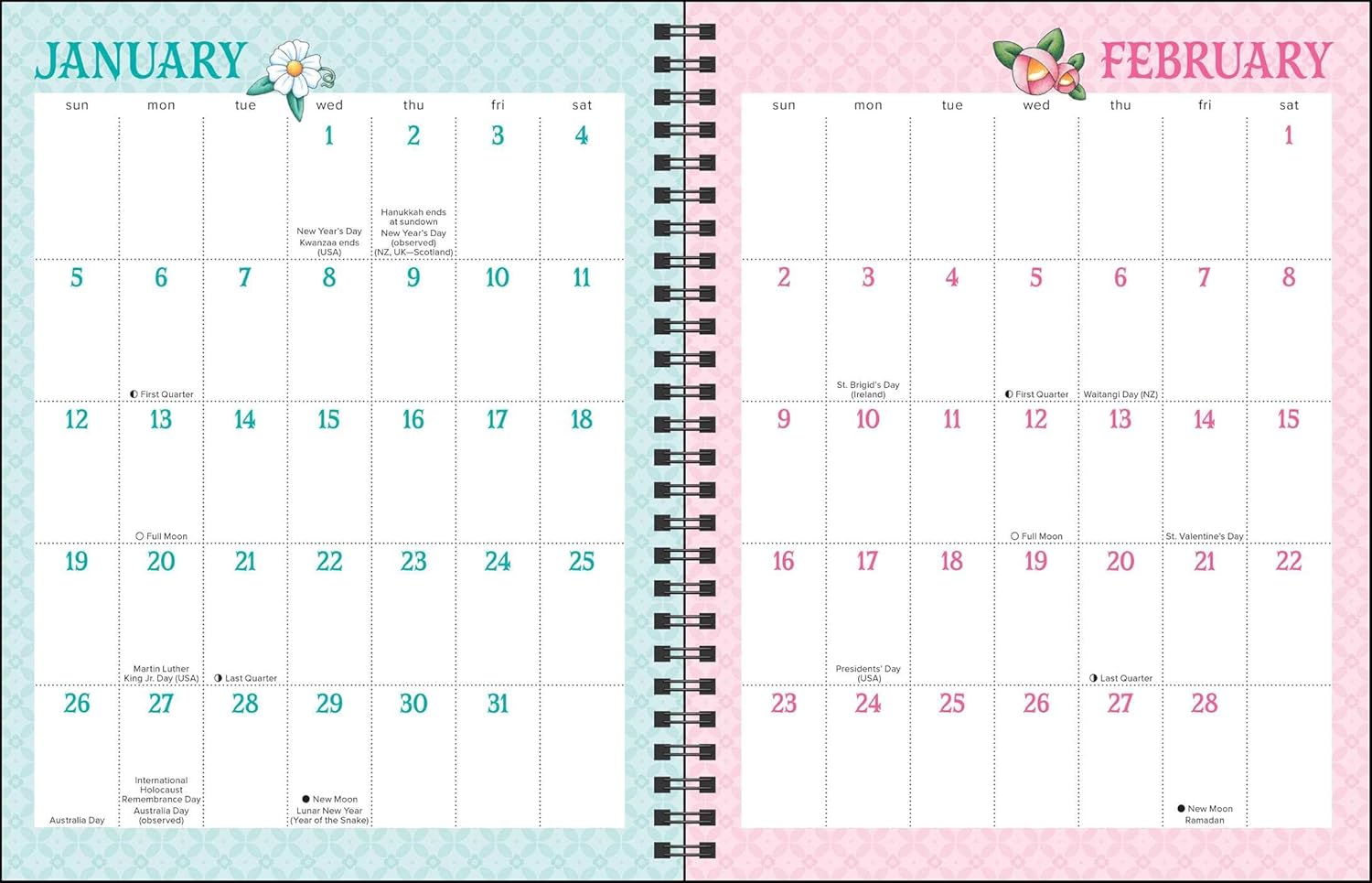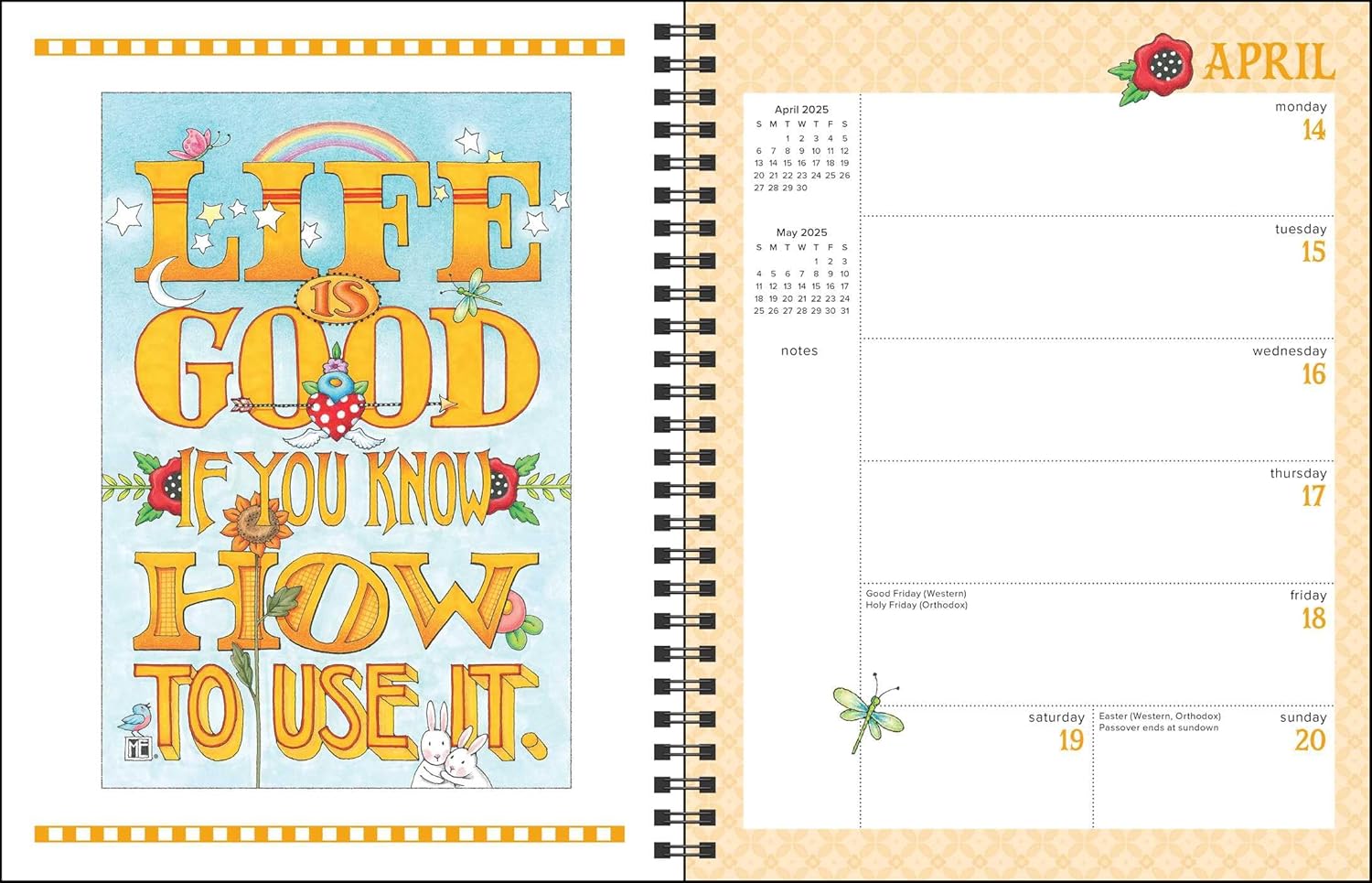 Features include: 7″ x 9″ (14″ x 9″ open) Spiral bound Sturdy softcover Printed on FSC-certified paper with soy-based ink Calendar lays flat when open 12-month planner: January-December 2025 Weekly planning pages for 2025 to keep track of events, appointments, and meetings Full-color artwork on each weekly spread Space at the back for 2026 planning and to jot down special days, names and numbers, and notes Year-at-a-glance pages for 2024, 2025, and 2026 Official major world holidays and observances Moon phases, based on Universal Time An illustrated saying on each weekly spread