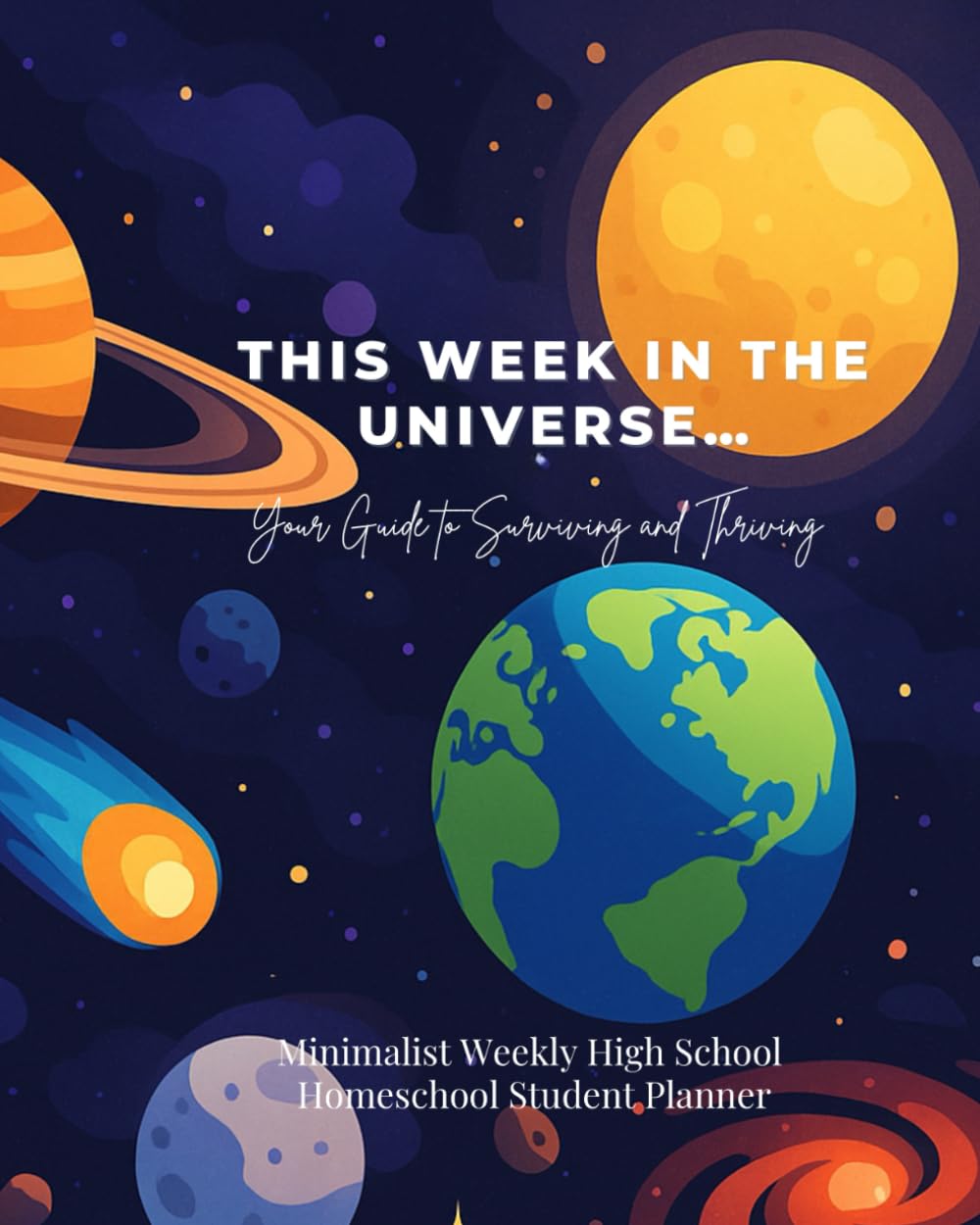 Flat lay of homeschool student planner with space theme coverFlat lay of homeschool student planner with space theme cover