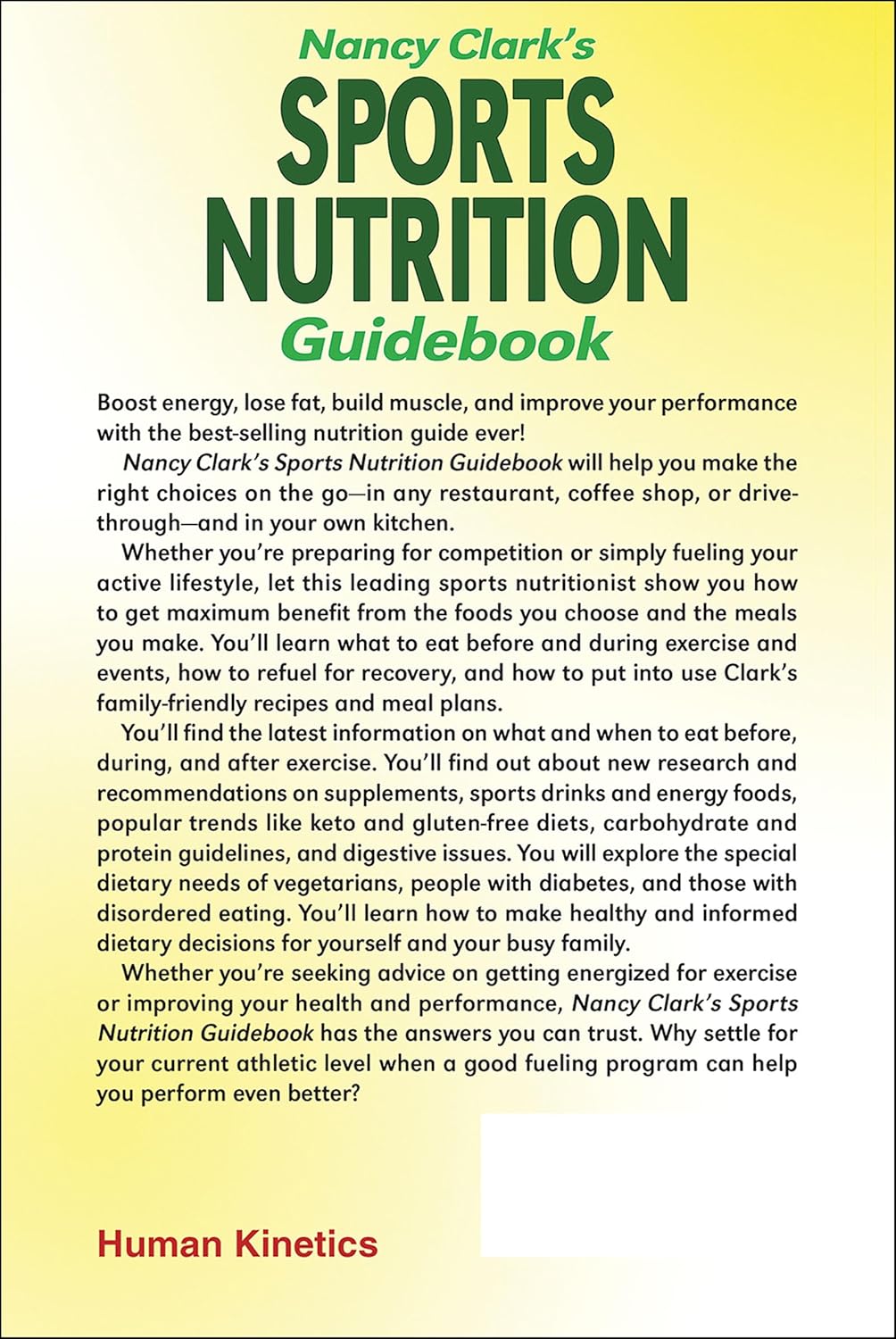 In Nancy Clark’s Sports Nutrition Guidebook, you’ll get real-world advice from an internationally respected and trusted sports nutritionist. You’ll find the latest research and information on what to eat before, during, and after exercise; sport drinks and energy foods; popular trends like keto and gluten-free diets; when and how much carbohydrate to eat; meal patterns that fit your training schedule; sustainability; and digestive issues. You’ll learn practical tips regarding vegan, diabetic, gluten-free, low-FODMAP, and bariatric diets. You’ll also find help for athletes with anorexia and binge-eating disorders. You’ll learn how to resolve confusion about what to on a daily basis so you can make healthy and informed dietary decisions for yourself and your busy family.