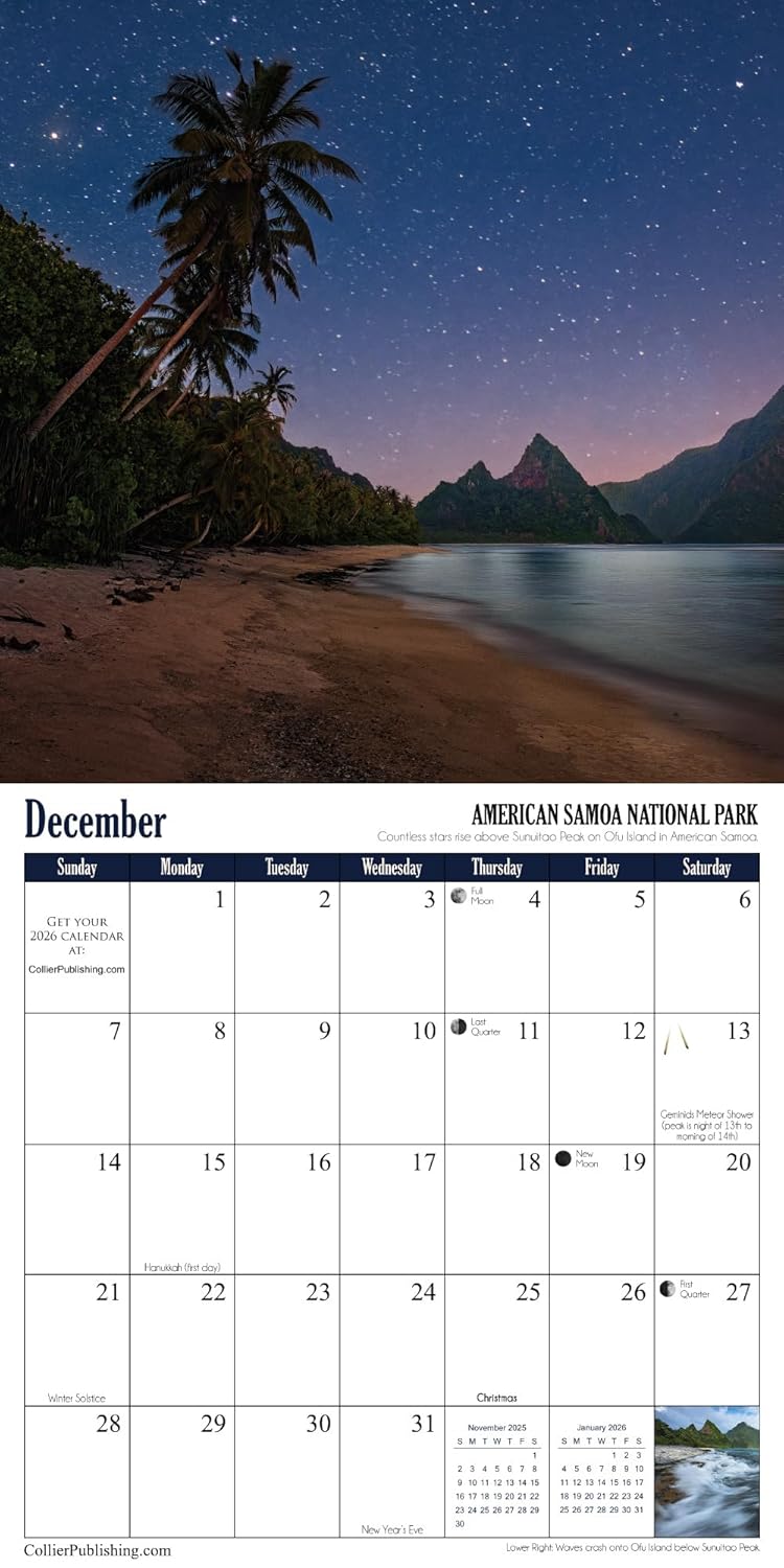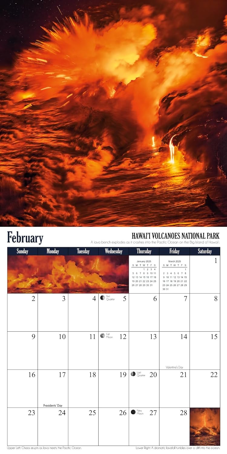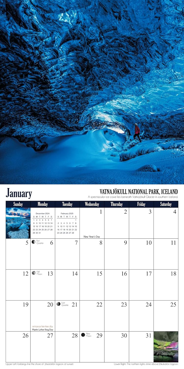 Embark on a breathtaking adventure through the world’s most stunning national parks with photographer Grant Collier. This 12-month calendar showcases spectacular images from nine iconic U.S. parks, including the Grand Canyon, Arches, Hawaiʻi Volcanoes, and Rocky Mountain. The journey extends to three remarkable parks abroad in Iceland, Canada, and Japan. Complete with moon phases, meteor shower dates, holidays, and NPS fee-free days, this calendar is a must-have for nature enthusiasts.