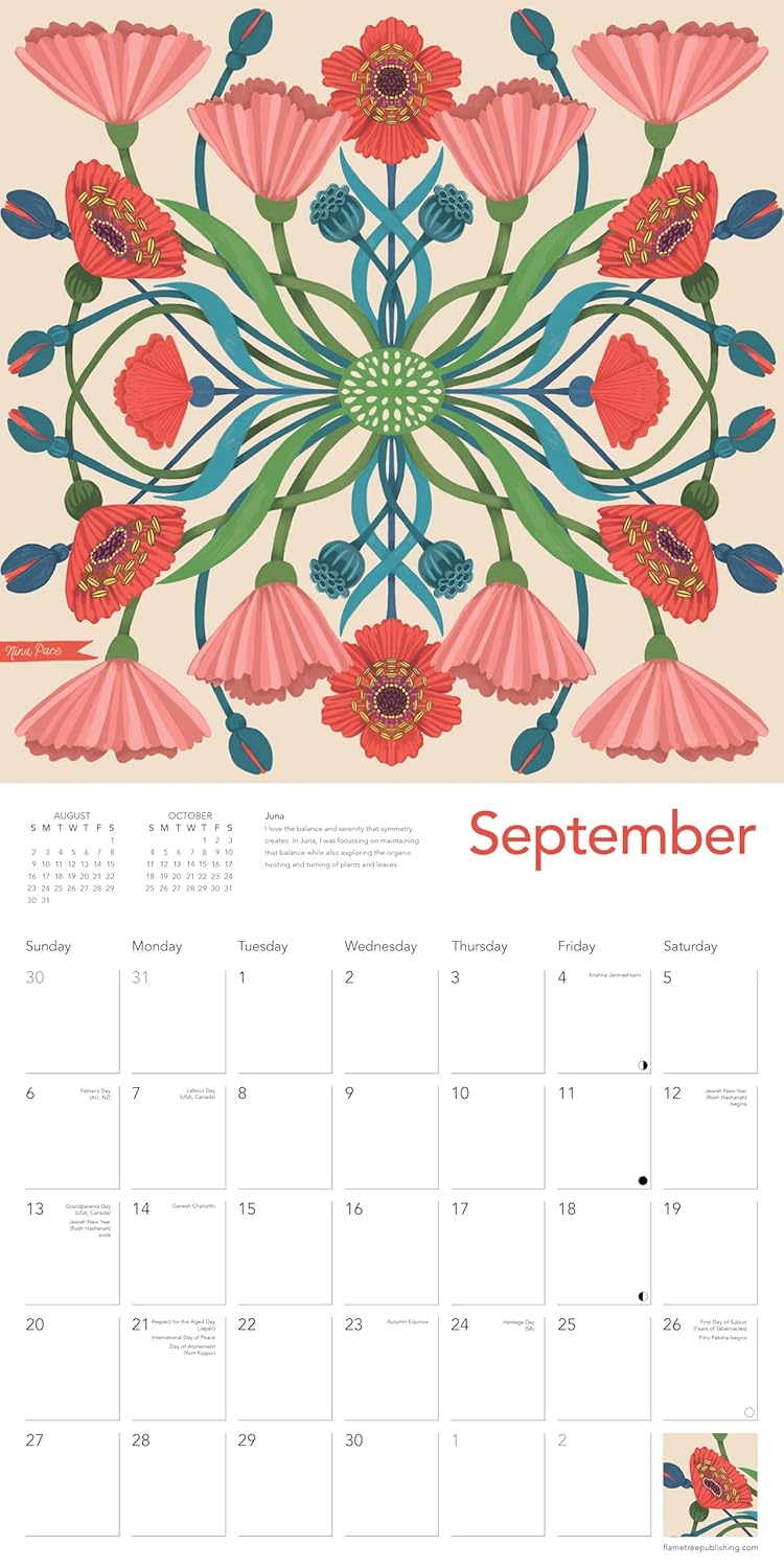 Nina Pace is a painter, illustrator and surface designer based just outside New York City, whose artwork embraces the full and glorious spectrum of hues and patterns embodied in the natural world. She is awestruck by the sheer variety of petal shapes, the detailed patterning and vein layouts. When creating a new piece, Nina takes this inspiration from nature and lets the design build organically. This calendar showcases 12 of her bold and intricate works, accompanied by words from the artist herself. The datepad features previous and next months views in this art calendar. Printed on FSC-certified paper, with plastic-free packaging.