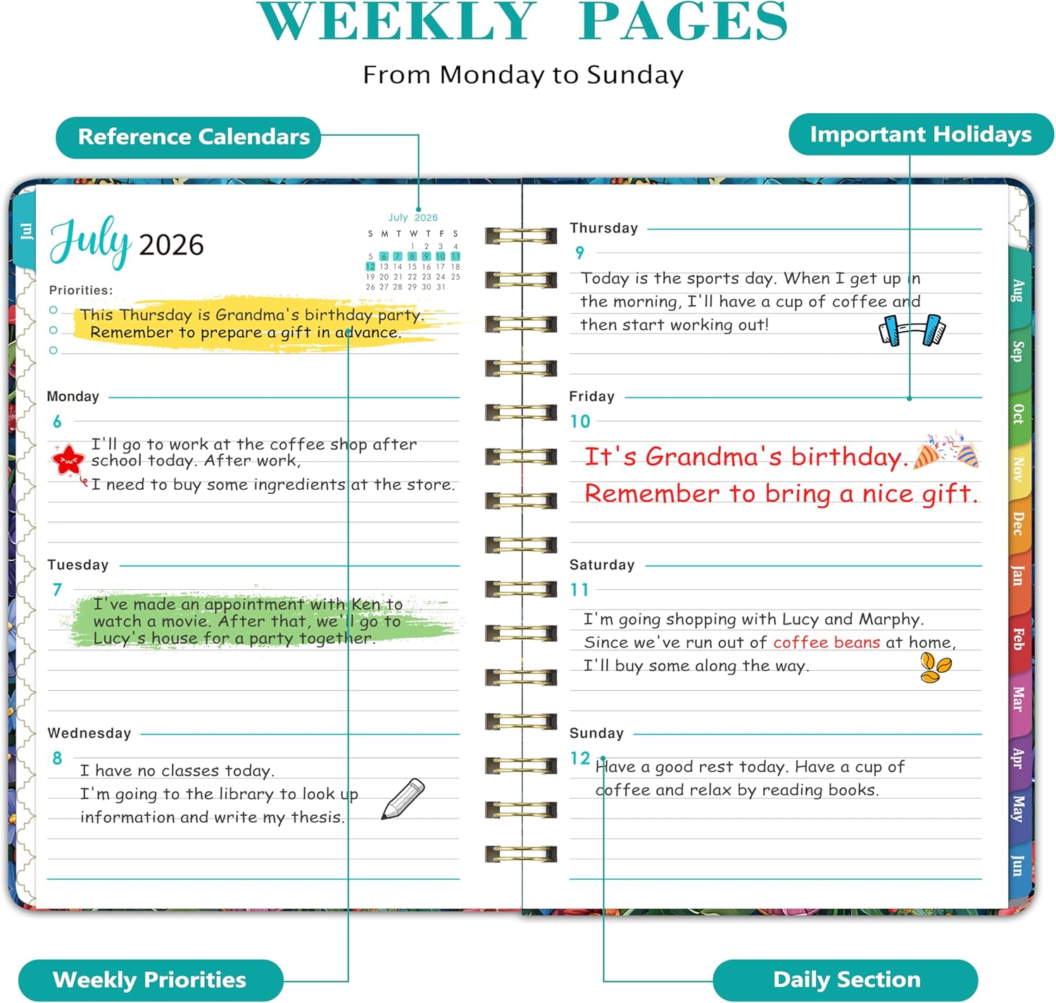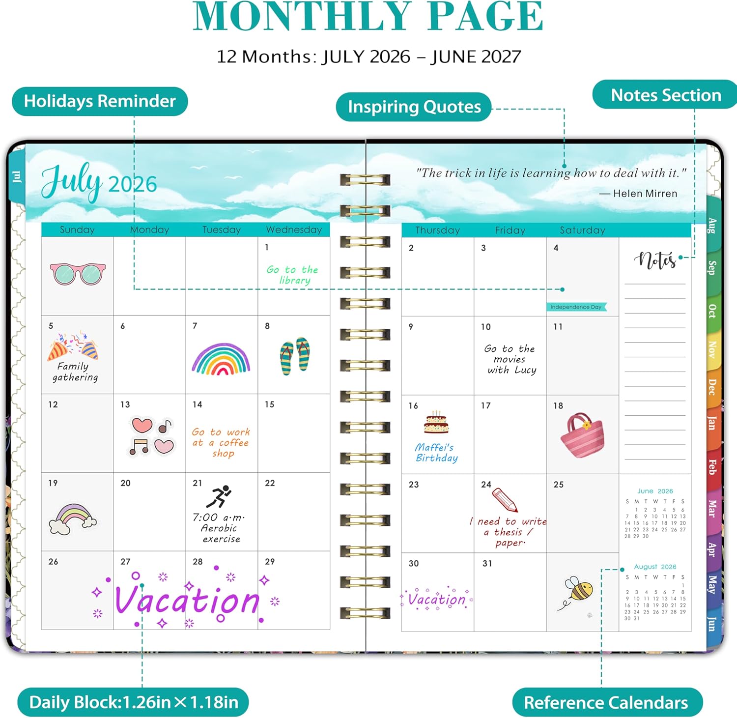 ✨Designed to Help You Succeed – Featuring color-coated monthly tabs for quick navigation, premium thick no-bleed paper, twin-wire lay-flat binding, two-sided back pocket for notes, and extra pages for goals and contacts, this academic planner 2026-2027 is packed with thoughtful details to support your productivity.