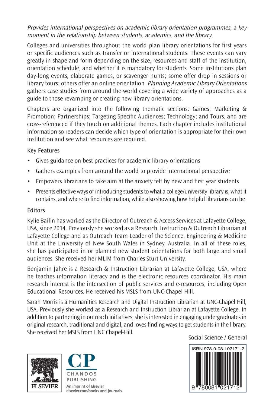 Gives guidance on best practices for academic library orientationsGathers examples from around the world to provide international perspectiveEmpowers librarians to take aim at the anxiety felt by new and first year studentsPresents effective ways of introducing students to what a college/university library is, what it contains, and where to find information, while also showing how helpful librarians can be