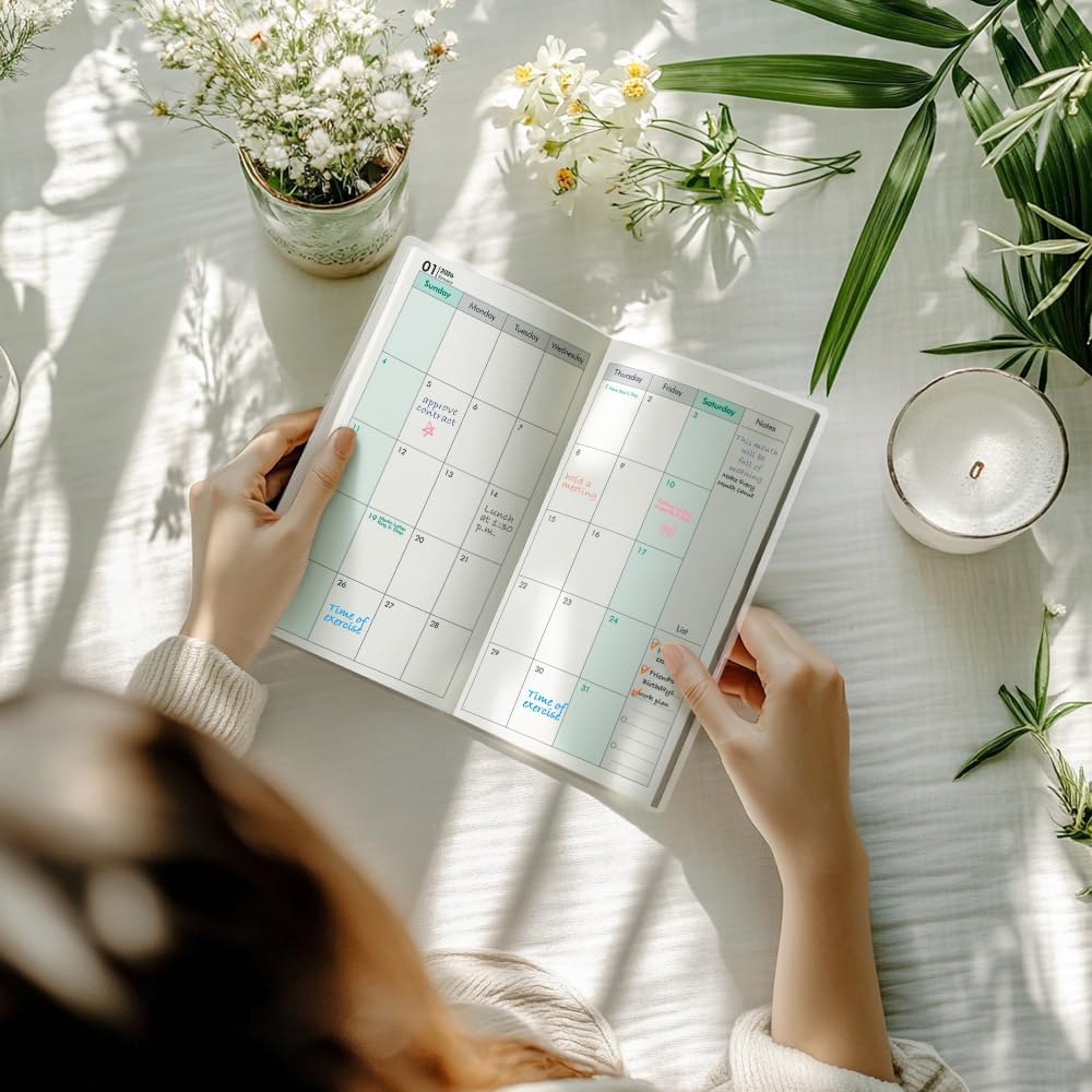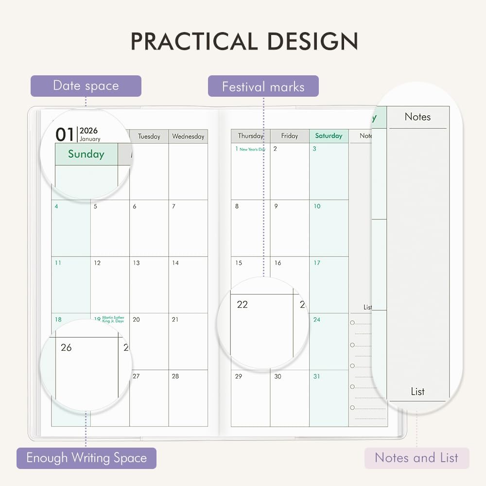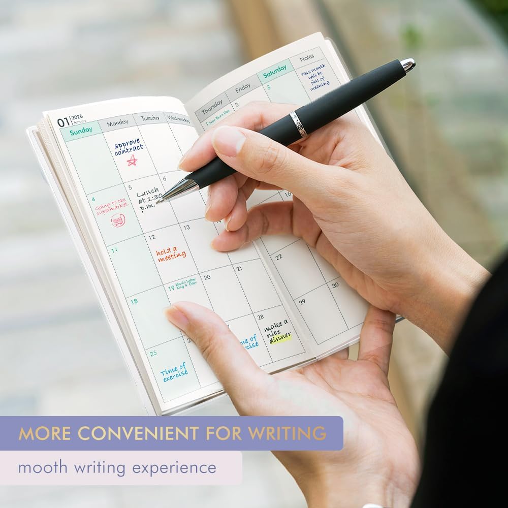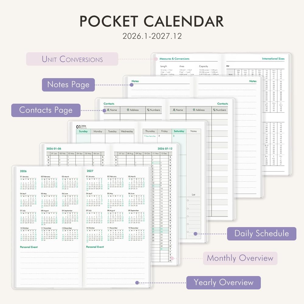 【Waterproof and durable】: The pocket calendar uses high-quality acid-free paper that is resistant to ink bleeding and smudging, providing a silky smooth writing experience. The cover is made of transparent PVC material, making it waterproof and dustproof, thus extending its lifespan.