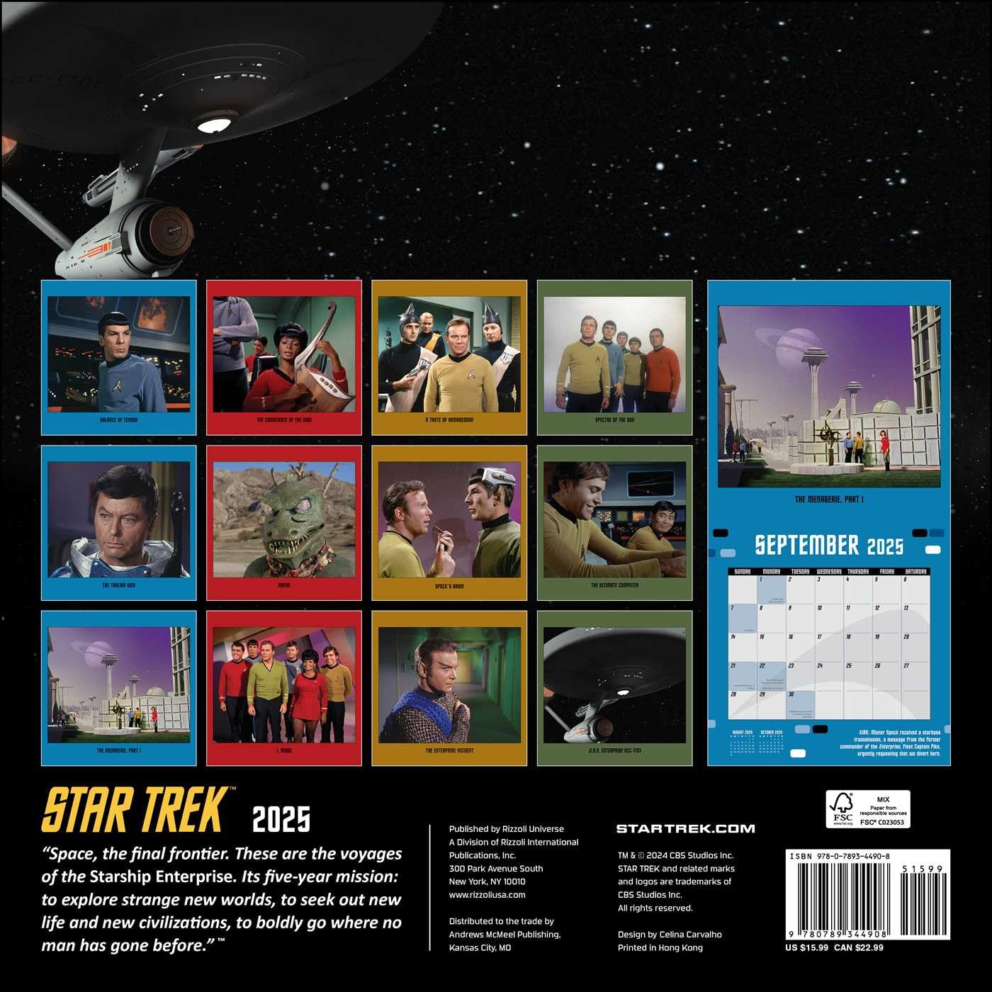 From the “#1 cult television series of all time” (TV Guide), the officially licensed Star Trek™ 2025 Wall Calendar: The Original Series features full-color photos of the entire original bridge crew of the U.S.S. Enterprise, including Captain James T. Kirk (William Shatner), First Officer Mr. Spock (Leonard Nimoy), Dr. Leonard McCoy (DeForest Kelley), Lieutenant Sulu (George Takei), Lieutenant Uhura (Nichelle Nichols), Ensign Chekov (Walter Koenig), and Chief Engineer Montgomery Scott (James Doohan).