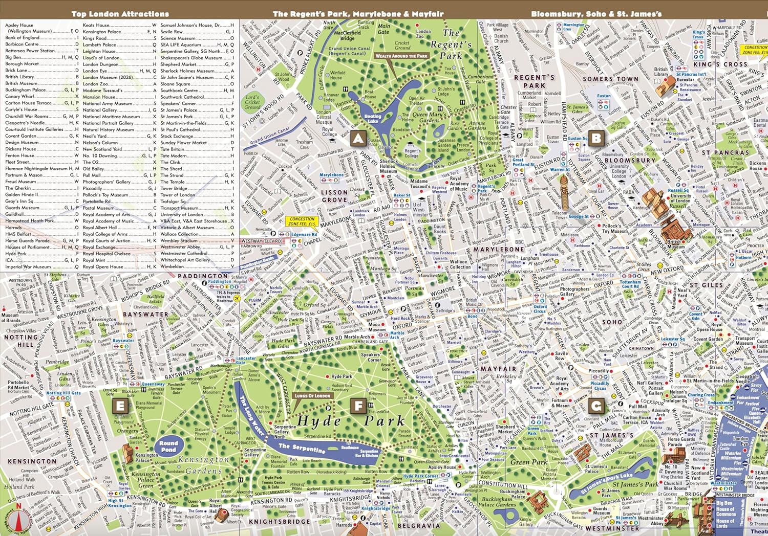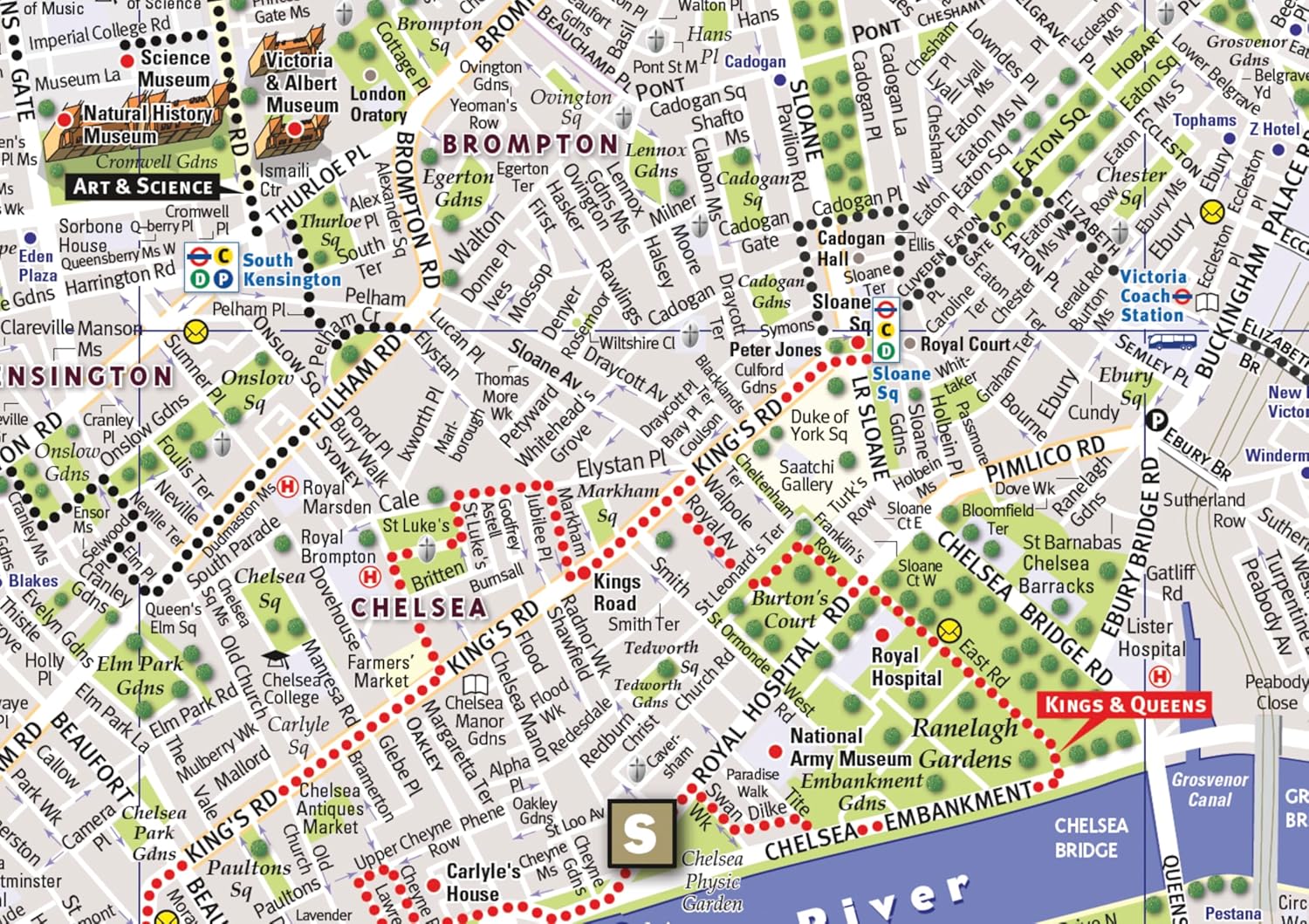 Among our favorite walks: from The Mile Square City, now the Financial Centre, to St Paul’s crossing Millennium Bridge to Tate Modern with grand views back over the Thames. Knightsbridge and Belgravia are among the toniest neighborhoods. Start at Harrods, the mother of all department stores, to see the latest fashions and taste from the mind-boggling selections of hams on the ground floor, then walk off the calories in Hyde Park with a visit to Serpentine Gallery for cutting edge art and design. Or start the day sipping cappuccino at the London Review of Books store on Bury Pl, then take the 55 bus from Bloomsbury to the Sunday Flower Market on Columbia Rd in East London with lunch at Rochelle Canteen on Arnold Circus. Stroll down Brick Lane to check out the latest East End fashions. Whatever excursions you plan our laminated pocket sized map will make you travel with confidence and help create lasting memories.