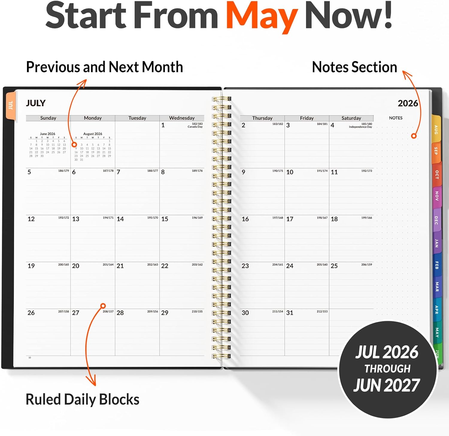 Monthly View: Each date box provides ample writing space and includes the previous and next month’s reference, ruled daily blocks with popular holidays, and Julian Dates for easy long-term project and appointment scheduling.