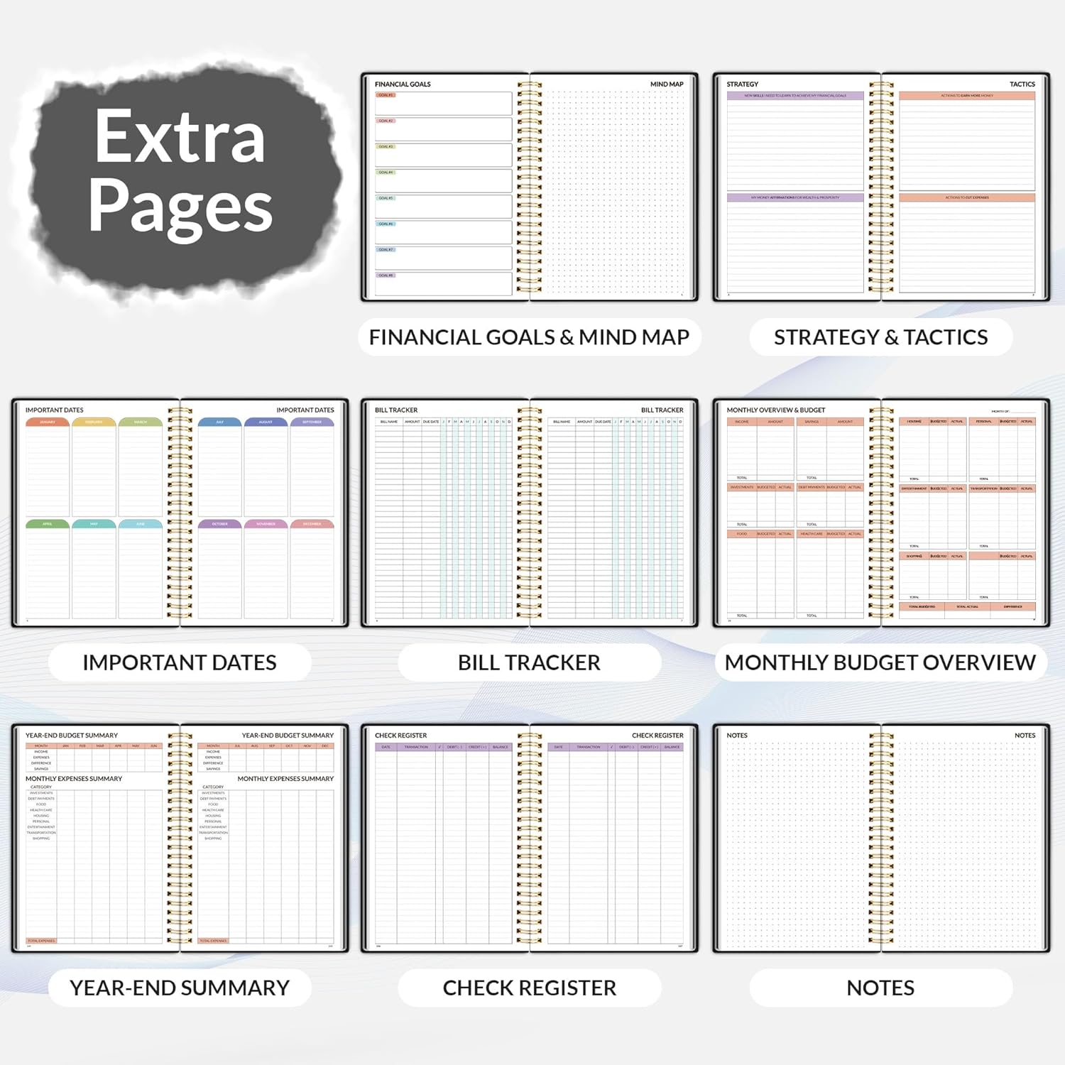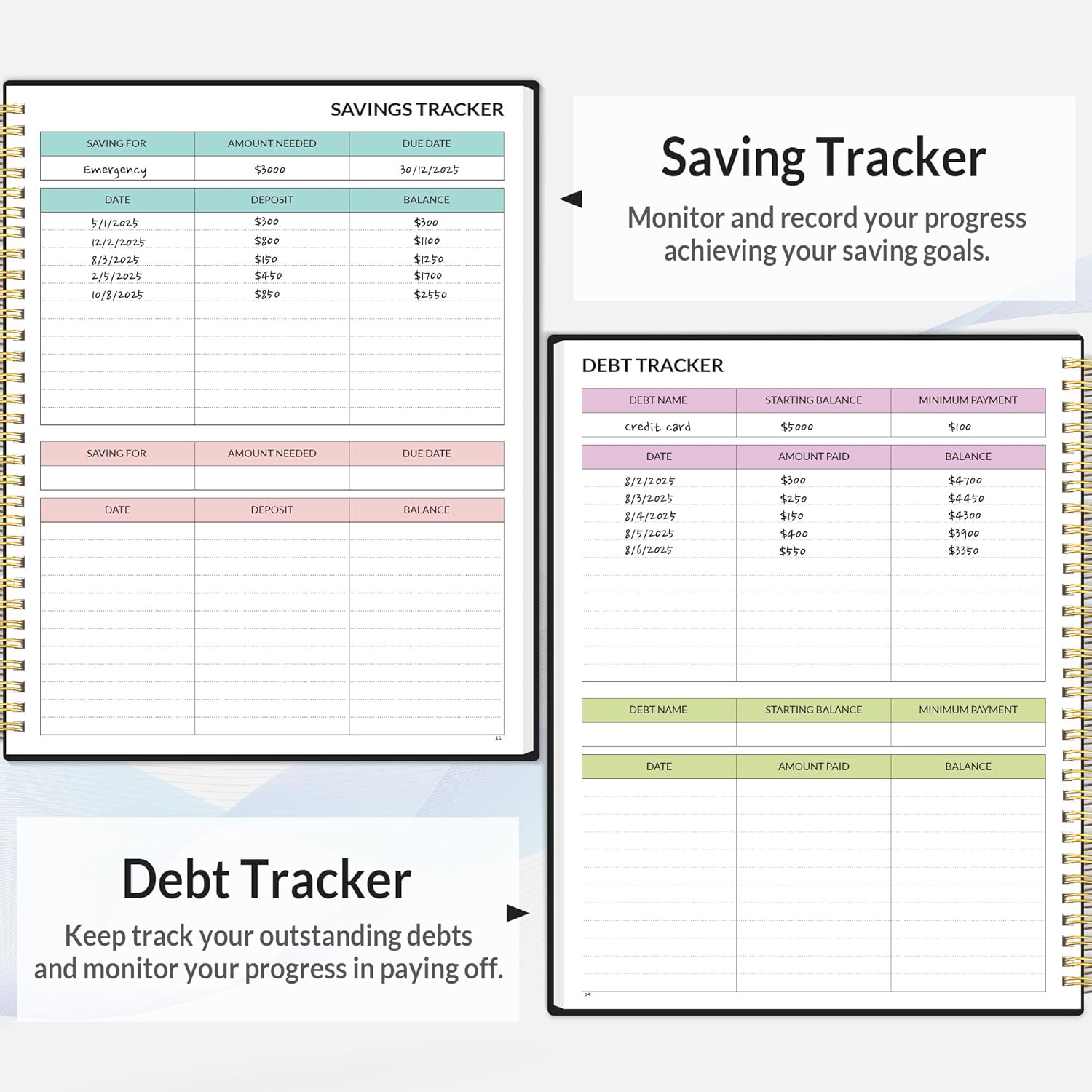 Two size : 8.5*11 inches and 6.4*8.5 inchesMore Optional:Classic Black | Sage Green | Pink | PurpleFinance books start with 1 page-financial goals, 1 page-Mind Map, 1 page-Financial Strategy, 1 page-Tactics, 2 pages-Important Dates, 4 pages-Bill Tracker, 4 pages-Saving Tracker, 8 pages-Debt Tracker, followed by 12 Months(10 pages per month, with distinct color themes to differentiate each). 2 pages-Holiday Budgeting, 2 pages-Review Your Year, 2 pages-Register and 11 pages-Notes(dotted). ![]()