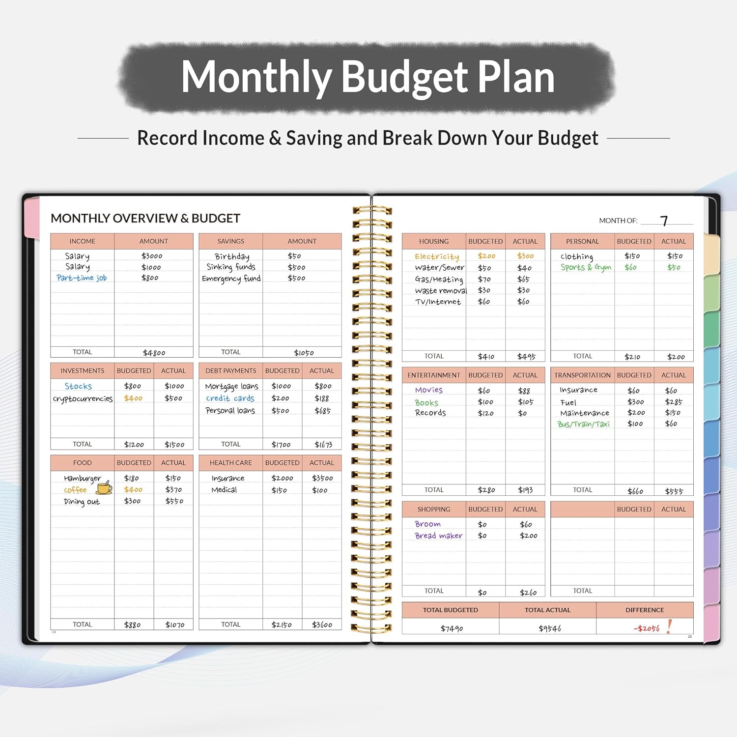 Our budget planner is thoughtfully designed with lively hues that bring a sense of fun to managing finances. It also includes bright, labeled dividers that help you easily find the pages you need, making the experience both engaging and efficient!