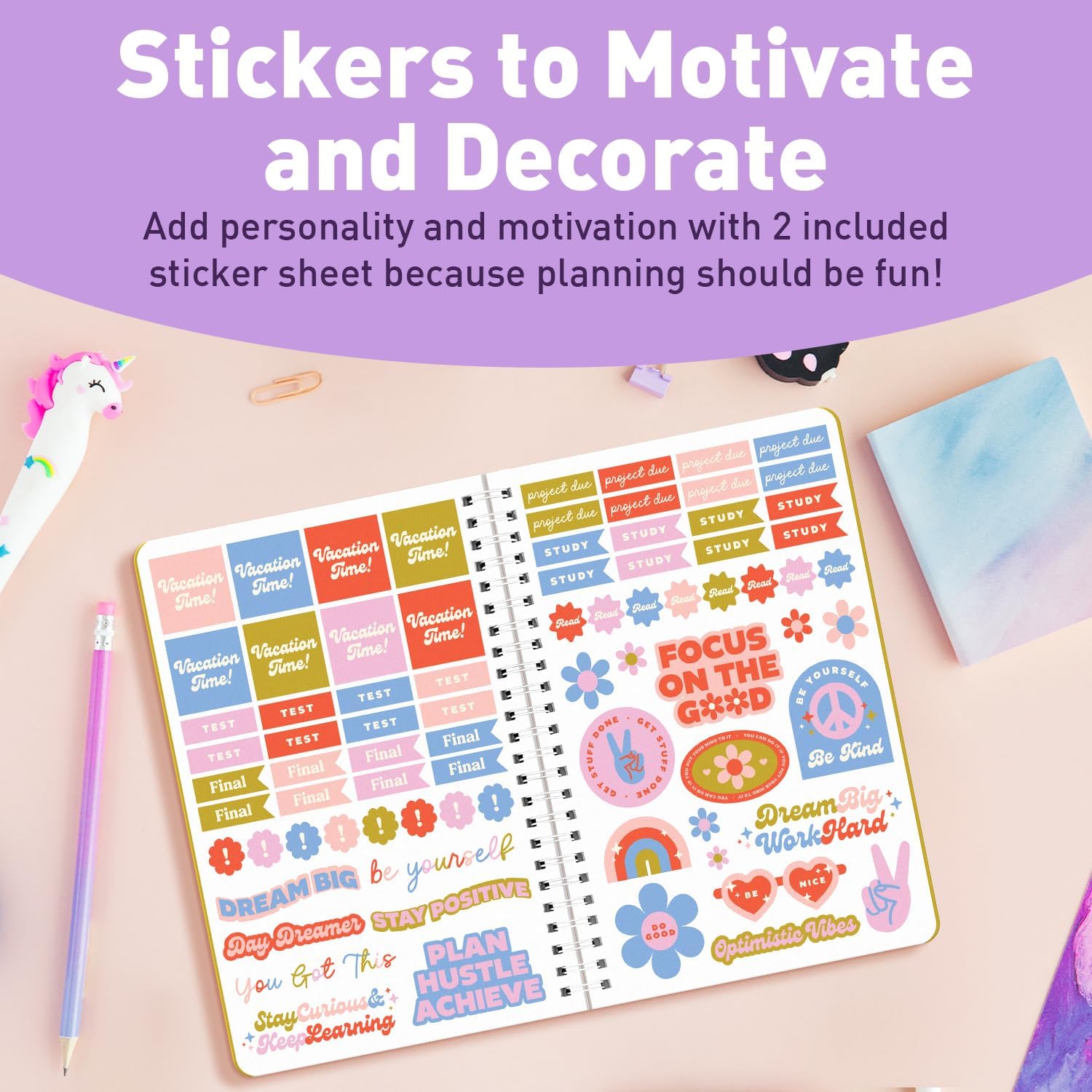 Fun & Functional Extras – Includes 2 sticker sheets to help you mark vacations, deadlines, finals, and study sessions. Motivational slogans and colorful icons add a fun touch to your planning routine.