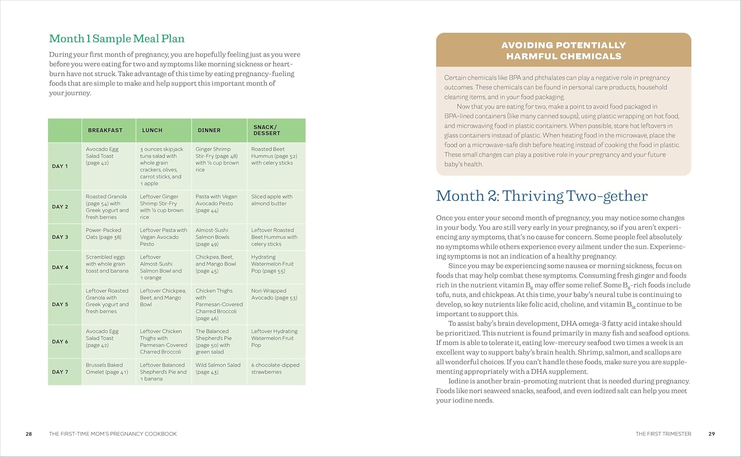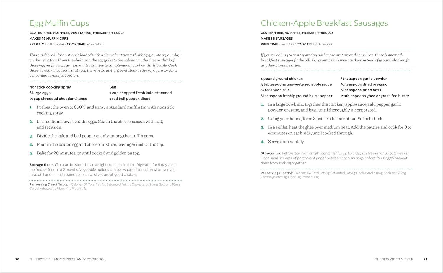 The ultimate food list―Find a clear rundown of the most important nutrients mom and baby need (and how much), along with a list of all the foods to avoid and why.Guidance for each month―Get detailed explanations of the body’s changes during each month of pregnancy, and find a meal plan to match.Beyond the third trimester―This pregnancy cookbook includes bonus guidance and recipes for staying healthy through postpartum recovery and nursing.
