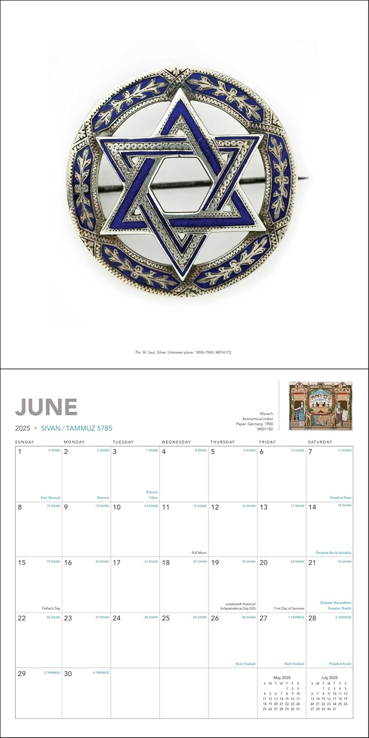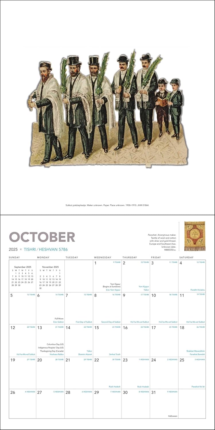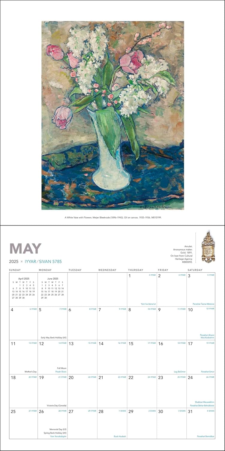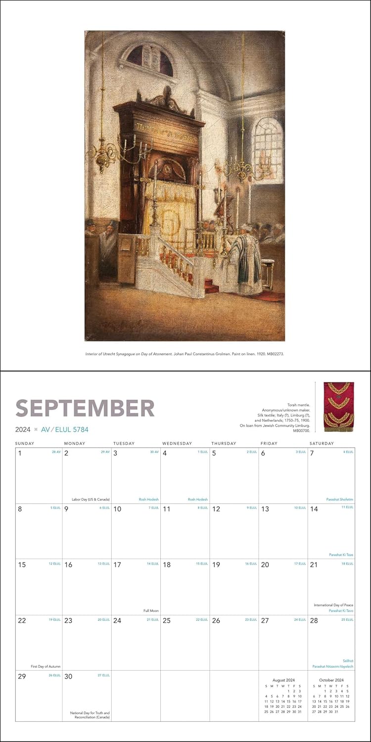 The Jewish Calendar 2024–2025 (5786) 16-Month Wall Calendar features 16 full-color Judaic ceremonial masterpieces from the internationally renowned collection of the Jewish Museum, Amsterdam.