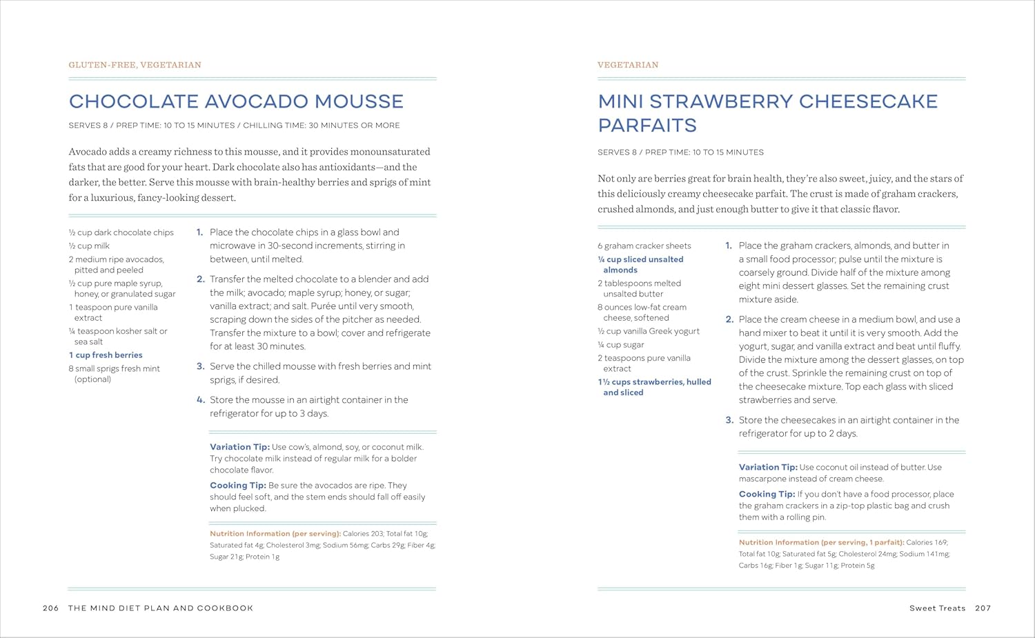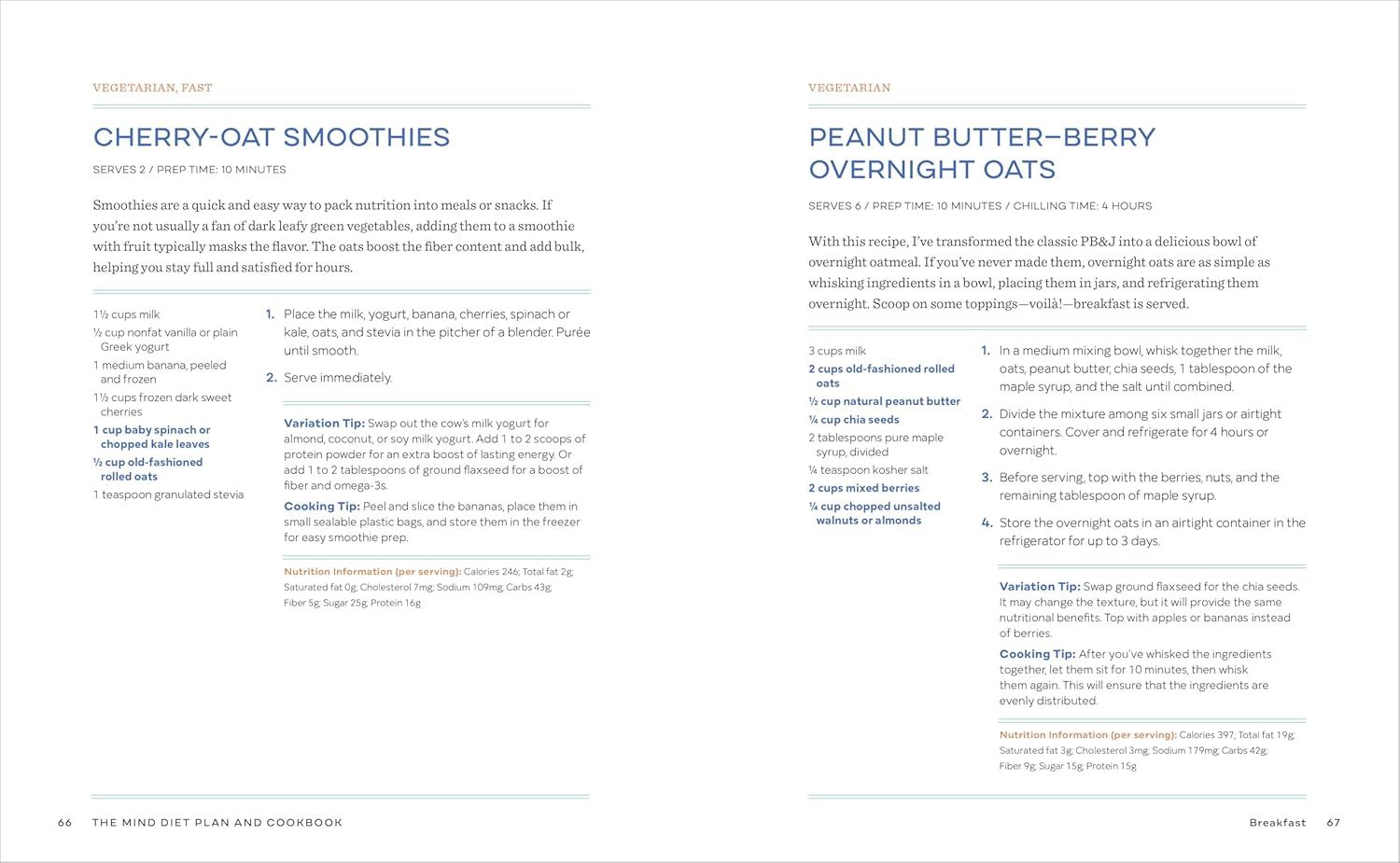 4-Week Meal Plan: Easy-to-follow weekly menus, complete with grocery lists and prep strategies, to simplify your start.75+ Dietitian-Designed Recipes: From Cherry Oat Smoothies to Moroccan Chicken Tagine, enjoy meals that are delicious, accessible, and proven to support brain function.The MIND Diet Made Simple: Learn exactly what to eat more of, what to limit, and how to build meals that nourish both brain and body.Easy Lifestyle Tips: Enhance your results with stress management, sleep, and movement guidance that complement your diet.
