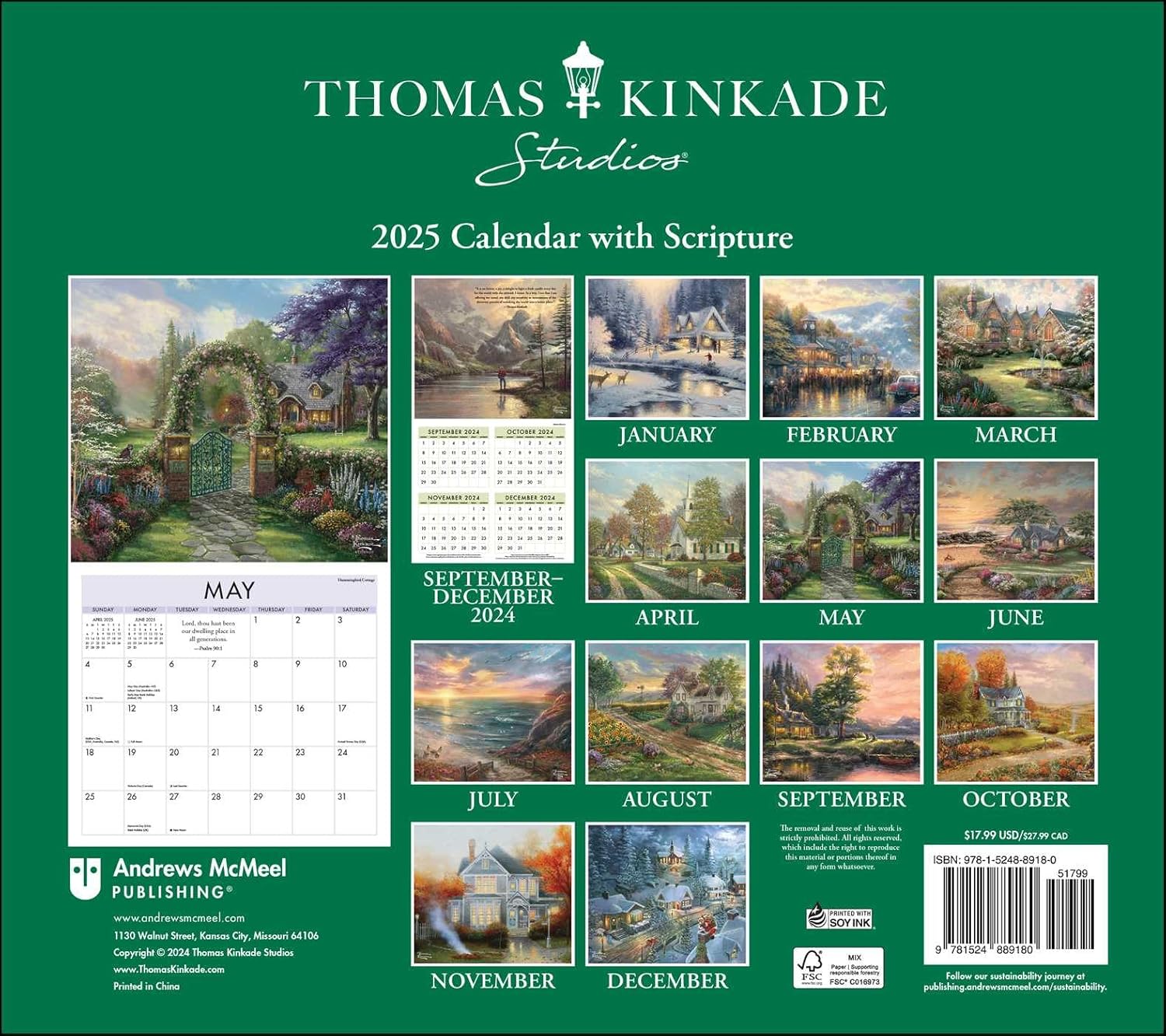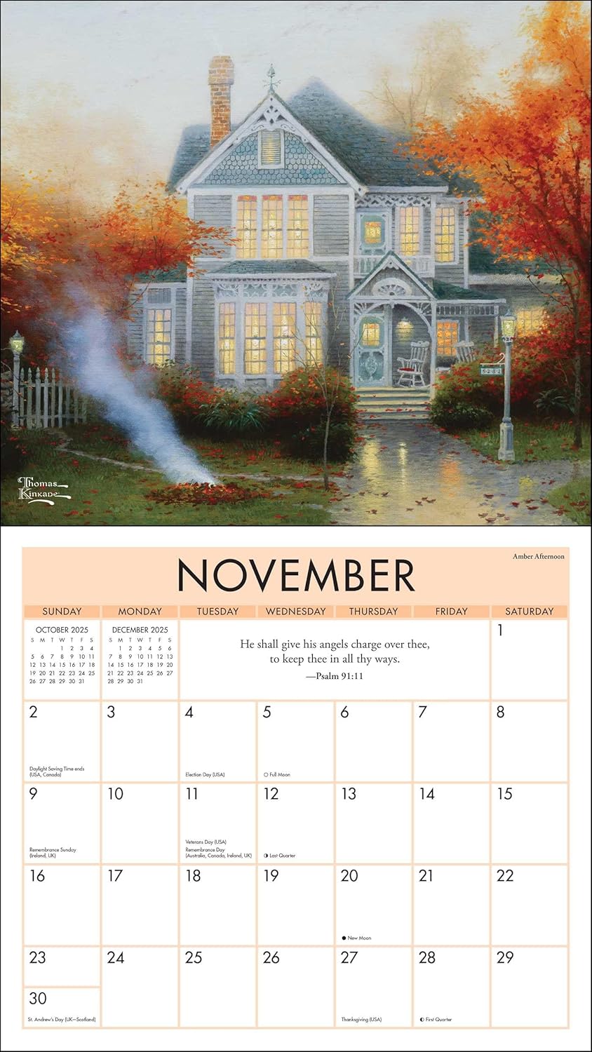 Features include: Matching plastic-free envelope 13.5″ x 12″ (13.5″ x 24″ open) Printed on FSC certified paper with soy-based ink Planning spread for September–December 2024 Spans January–December 2025 Generous grid space to add appointment and reminders Each month has a verse from Psalms (King James Bible) Official major world holidays and observances Moon phases, based on Universal Time Images from paintings of scenic landscapes, cottages, and cities by Thomas Kinkade Studios