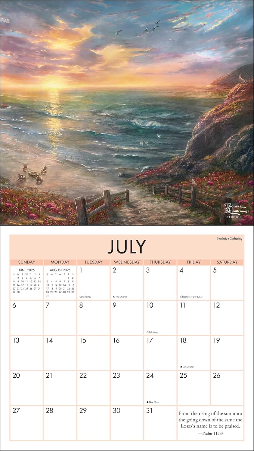 The Thomas Kinkade Studios 2025 Deluxe Wall Calendar with Scripture features beautiful full-color art, faith-building verses from the Psalms, and plenty of room to add your own events, appointments, and notes to each of the twelve monthly grids. This calendar comes packaged in a sturdy, matching, plastic-free envelope.